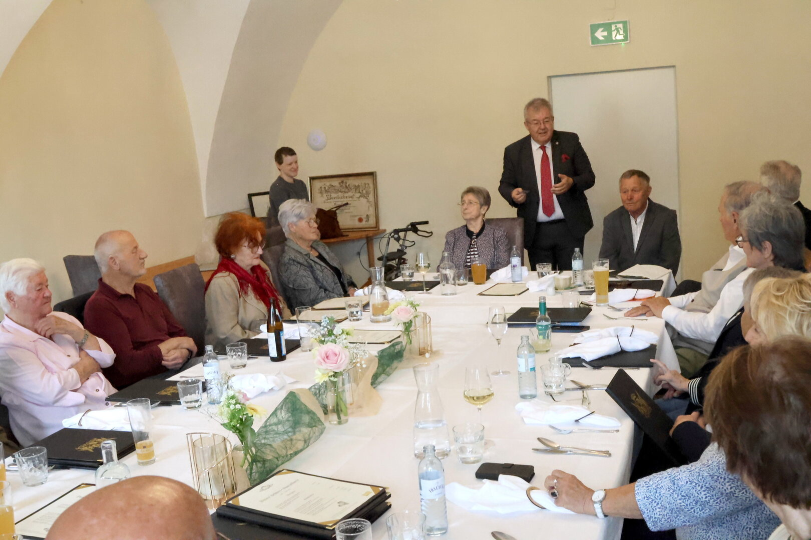 Auch Bürgermeister Walter Zemrosser ließ es sich nicht nehmen, die früheren Schülerinnen und Schüler persönlich willkommen zu heißen. Unter den 17 Anwesenden befanden sich unter anderem die aus Lölling stammende Filmlegende Otto Retzer, Stiftungsvorstand Günter Licker oder Gutsbesitzerin Maria Funder.