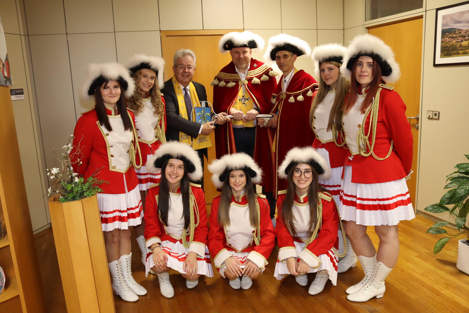 Präsident Carsten Passiel und Vize-Präsident Bernd Hensel erhielten – nicht ganz freiwillig – den Stadtschlüssel aus den Händen von Bürgermeister Walter Zemrosser. Mit einem Augenzwinkern versprachen sie, die Stadt „mit närrischer Ordnung und fröhlicher Disziplin“ zu regieren. Den Narren eine glückliche Regentschaft, unser Bürgermeister kann sich jetzt bis Faschingsdienstag ausruhen – Äha Schau Schau