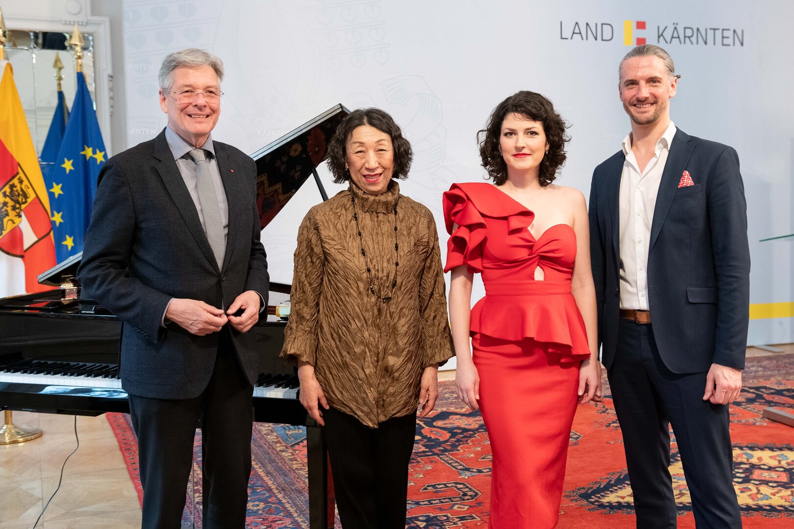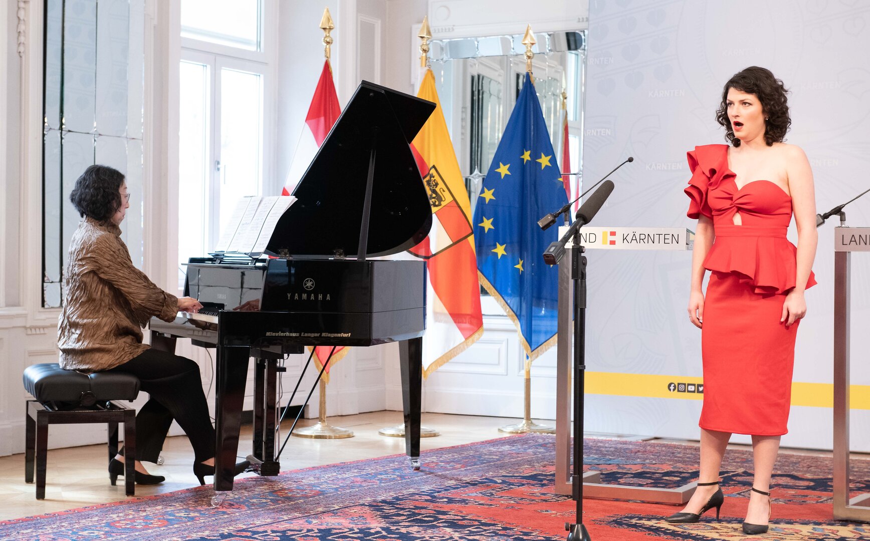 Junge Gesangs- und Musiktalente beim Sprung auf die Bühne zu unterstützen und sie nachhaltig zu vernetzen – das ist das Ziel der Althofener Meisterklassen. Sie finden heuer mit sechs Meisterkursen, zwölf Konzerten und einer Ausstellung über Komponist Arnold Schönberg vom 4. bis 17. August bei freiem Eintritt statt. Sechs Preise mit einer Gesamtdotierung von 15.400 Euro werden vergeben. Details dazu gaben heute, Mittwoch, Kulturreferent Landeshauptmann Peter Kaiser und der künstlerische Leiter Johannes Fleischmann bei einer Pressekonferenz im Spiegelsaal der Landesregierung bekannt. Althofens Bürgermeister Walter Zemrosser informierte über die von der Stadtgemeinde gestifteten Preise und Klagenfurts Kulturstadtrat Franz Petritz über den erstmals zu vergebenden „Rising Star“ als Jugendförderpreis der Landeshauptstadt. Eine beeindruckende musikalische Kostprobe gab es von Mezzosopranistin Anna Tetruashvili, einer Preisträgerin des Vorjahres. Sie wurde von Sawako Yamada am Klavier begleitet.