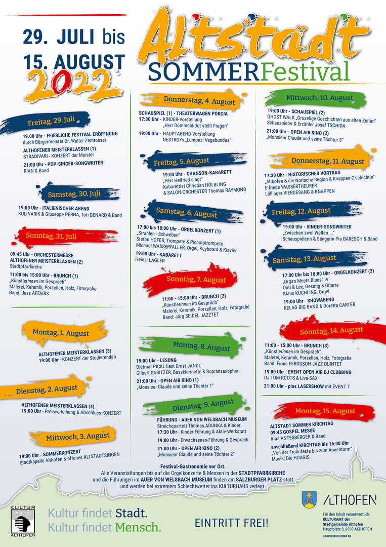 Das Altstadt Sommer Festival macht den Sommer in Althofen erst perfekt, finden Bürgermeister Walter Zemrosser sowie Vize-Bürgermeisterin und Kulturstadträtin Doris Hofstätter: „Das 18-tägige Kulturfestival bietet auch in diesem Jahr ein vielfältiges kulturelles wie kulinarisches Programm. Gleichzeitig möchten wir auch Bürgerinnen und Bürger aus der Umgebung dazu einladen, die Veranstaltungen in der Althofener Altstadt zu genießen“. Alle Events - bis auf die Orgelkonzerte und Messen in der Stadtpfarrkirche und die Führungen im Auer von Welsbach-Museum - finden am Salzburger Platz statt und werden bei extremem Schlechtwetter ins Kulturhaus verlegt. Für kulinarische Highlights sorgt die Festival-Gastronomie vor Ort.