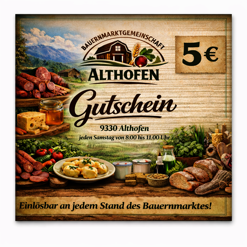 Gute Nachrichten für alle, die Regionalität schätzen und gerne Freude schenken: Ab sofort gibt es Gutscheine des Bauernmarktes Althofen, die an sämtlichen Marktständen eingelöst werden können. Die Beschenkten können selbst wählen, worauf sie sich freuen: Speck, Salami, Aufstriche, knackiges Gemüse, frisches Obst, regionale Milch- und Käseprodukte, Eier, Honig, Nudeln, Brot, Kuchen, Kräuterprodukte oder saisonale Spezialitäten direkt von den Produzentinnen und Produzenten. Der Bauernmarkt Althofen findet jeden Samstag von 8:00 bis 11:00 Uhr statt.