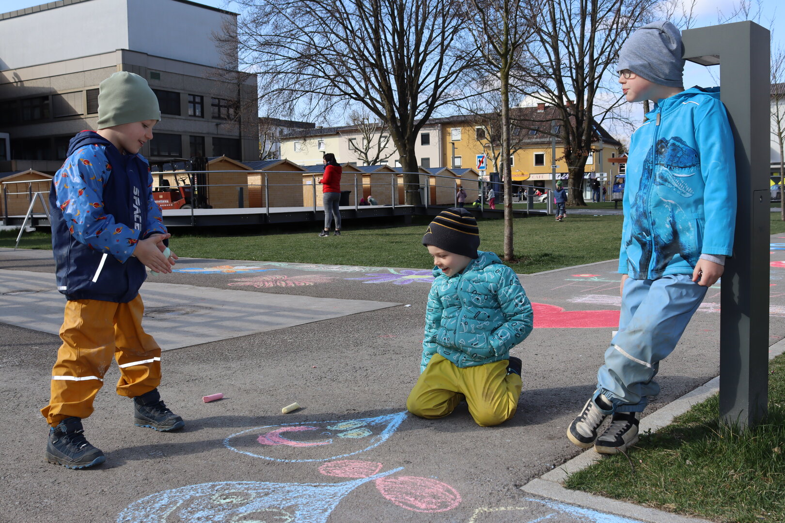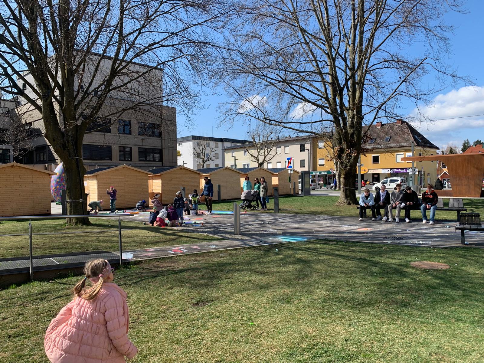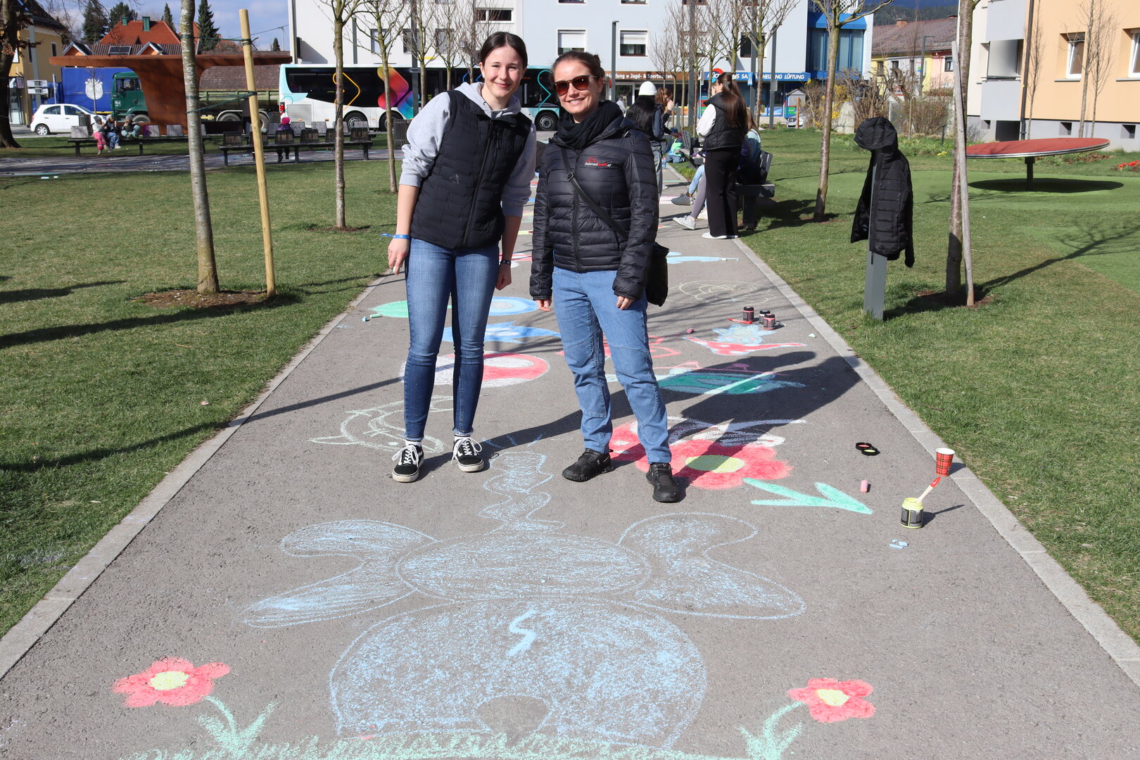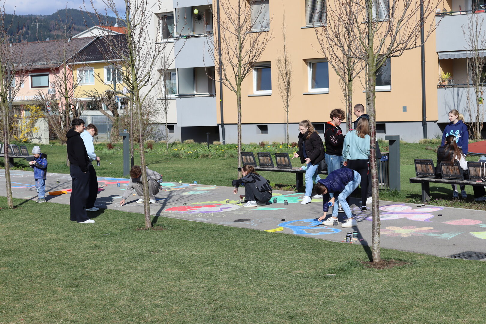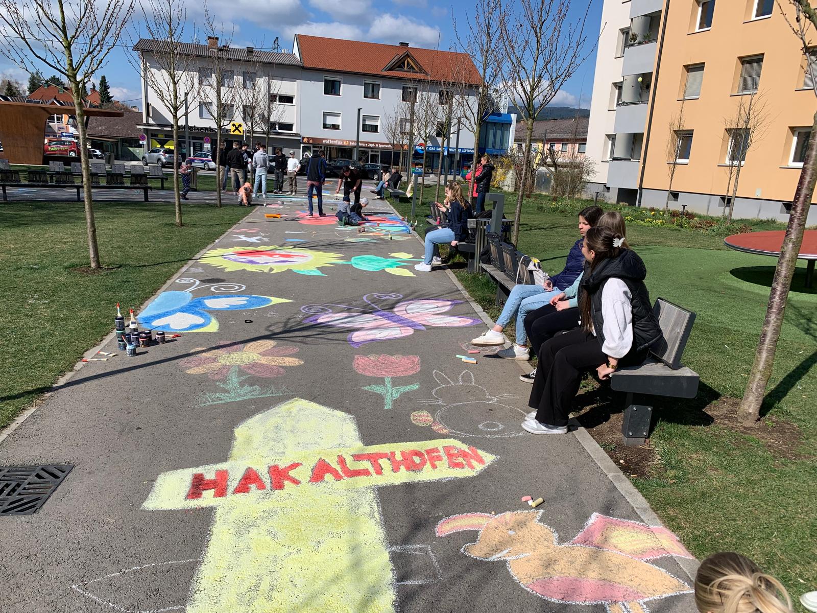 Im Stadtpark malten bei traumhaften Frühlingswetter Jugendliche der HAK Althofen sowie Kinder des Kindergartens Althofen wunderbare Kunstwerke auf den Asphalt. Umweltreferent Stadtrat Wolfgang Leitner und KEM-Manager Markus Löcker, die den „Tag des Zu-Fuß-gehens“ in Althofen organisiert hatten, beteiligten sich ebenfalls an der Schaffung von bunten Schmetterlingen, Ostereiern und vielem mehr. Zur Stärkung gab es für die begeisterten Malerinnen und Maler Krappfelder Eis der Familie Petra und Bernd Pobaschnig, Müsliriegel sowie Semmel. Mitgezeichnet haben unter anderem die Gemeinderäte Siegbert Schönfelder, Gernold Kloiber und Silvia Zeißler. Seht euch die „blühenden Wege“ im Stadtpark an, ihr werdet von den vielfältigen Zeichnungen begeistert sein!