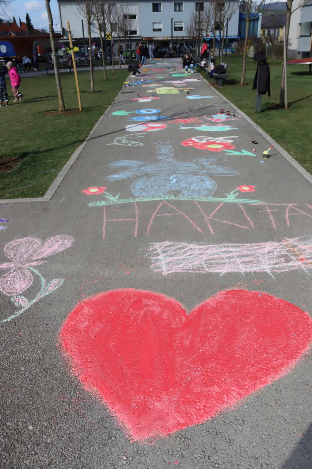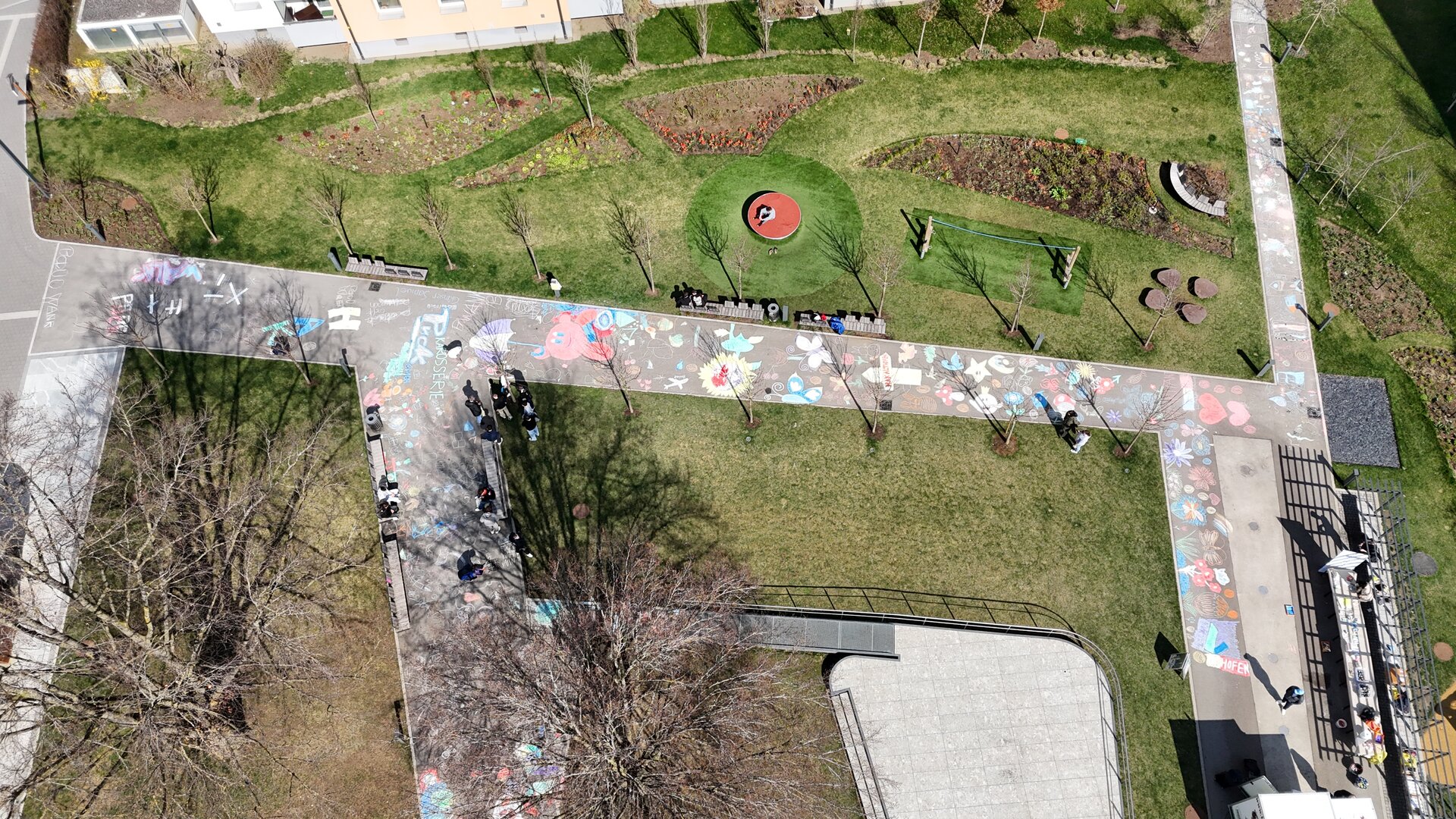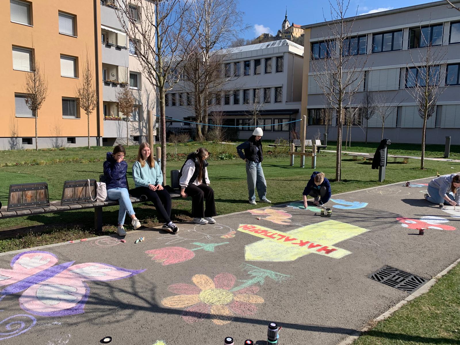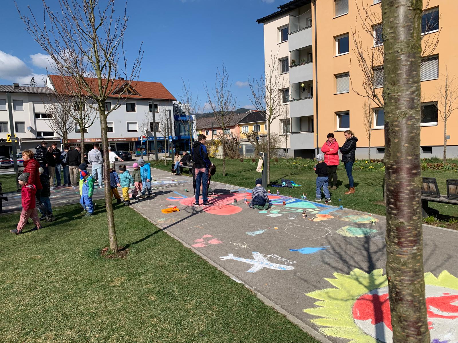 Im Stadtpark malten bei traumhaften Frühlingswetter Jugendliche der HAK Althofen sowie Kinder des Kindergartens Althofen wunderbare Kunstwerke auf den Asphalt. Umweltreferent Stadtrat Wolfgang Leitner und KEM-Manager Markus Löcker, die den „Tag des Zu-Fuß-gehens“ in Althofen organisiert hatten, beteiligten sich ebenfalls an der Schaffung von bunten Schmetterlingen, Ostereiern und vielem mehr. Zur Stärkung gab es für die begeisterten Malerinnen und Maler Krappfelder Eis der Familie Petra und Bernd Pobaschnig, Müsliriegel sowie Semmel. Mitgezeichnet haben unter anderem die Gemeinderäte Siegbert Schönfelder, Gernold Kloiber und Silvia Zeißler. Seht euch die „blühenden Wege“ im Stadtpark an, ihr werdet von den vielfältigen Zeichnungen begeistert sein!