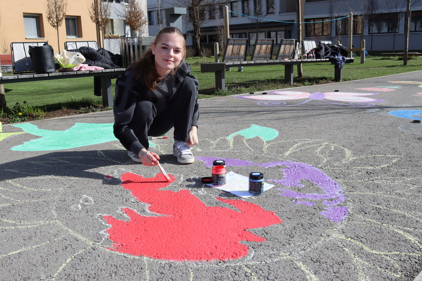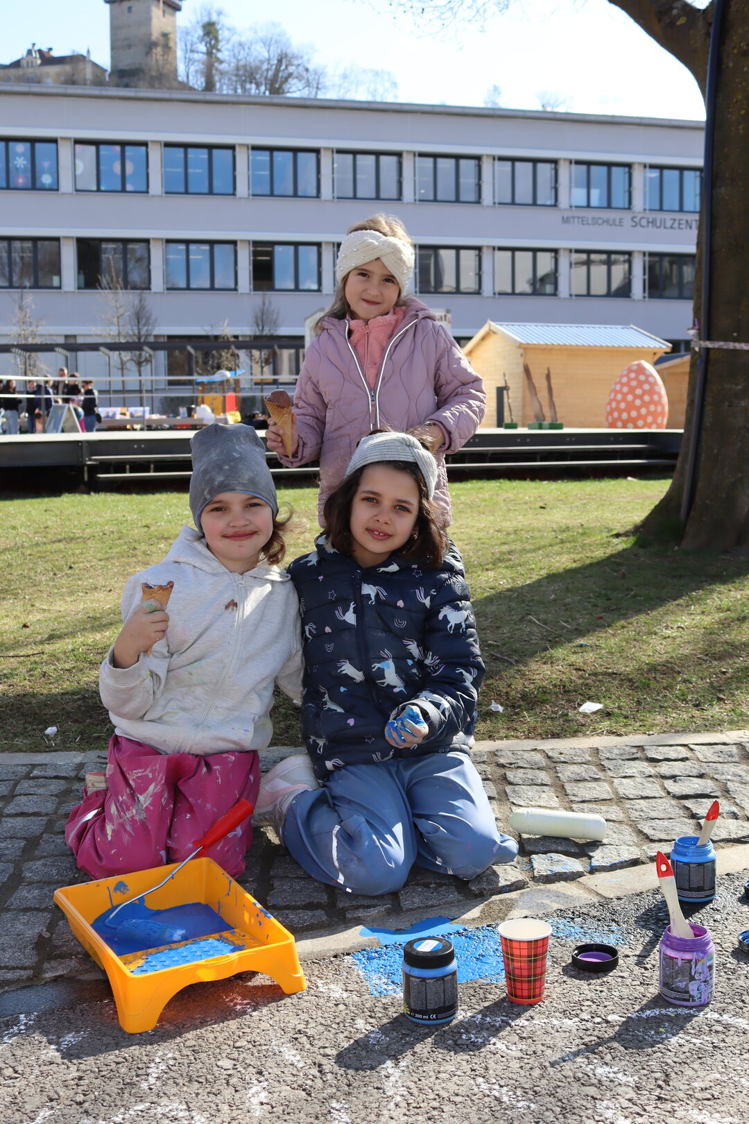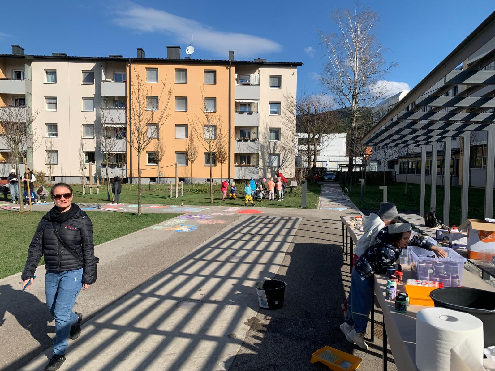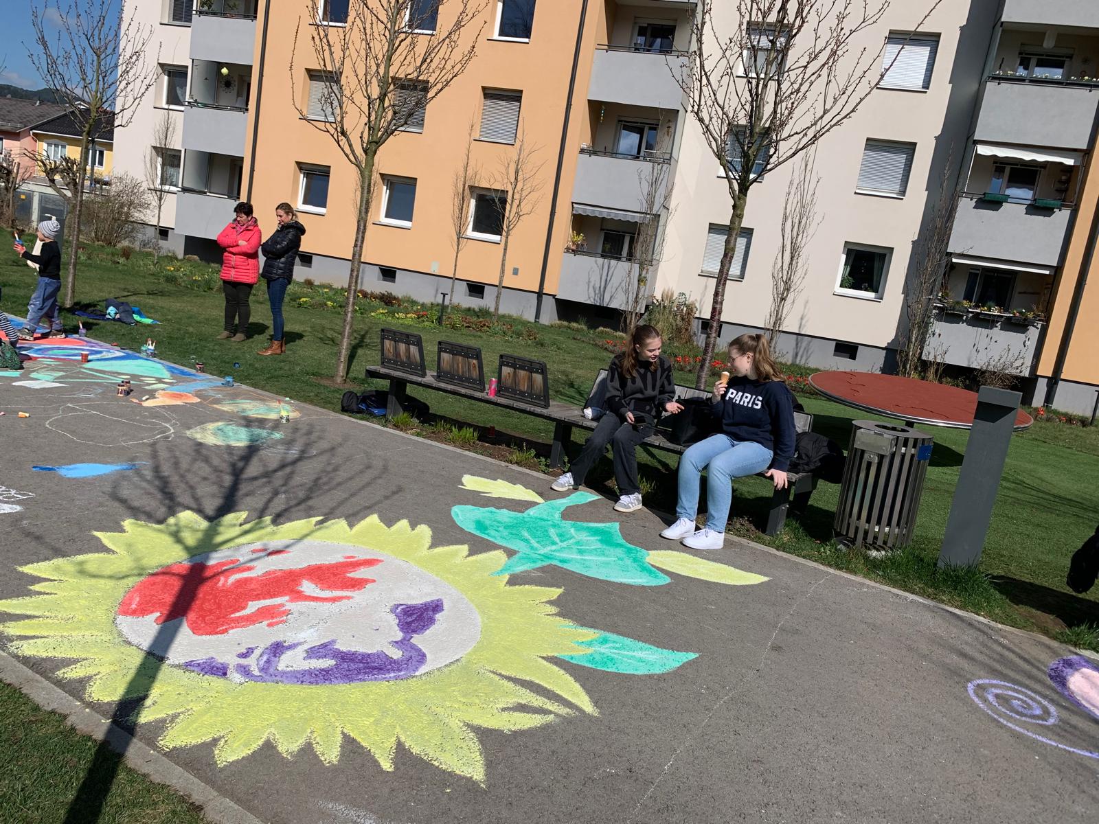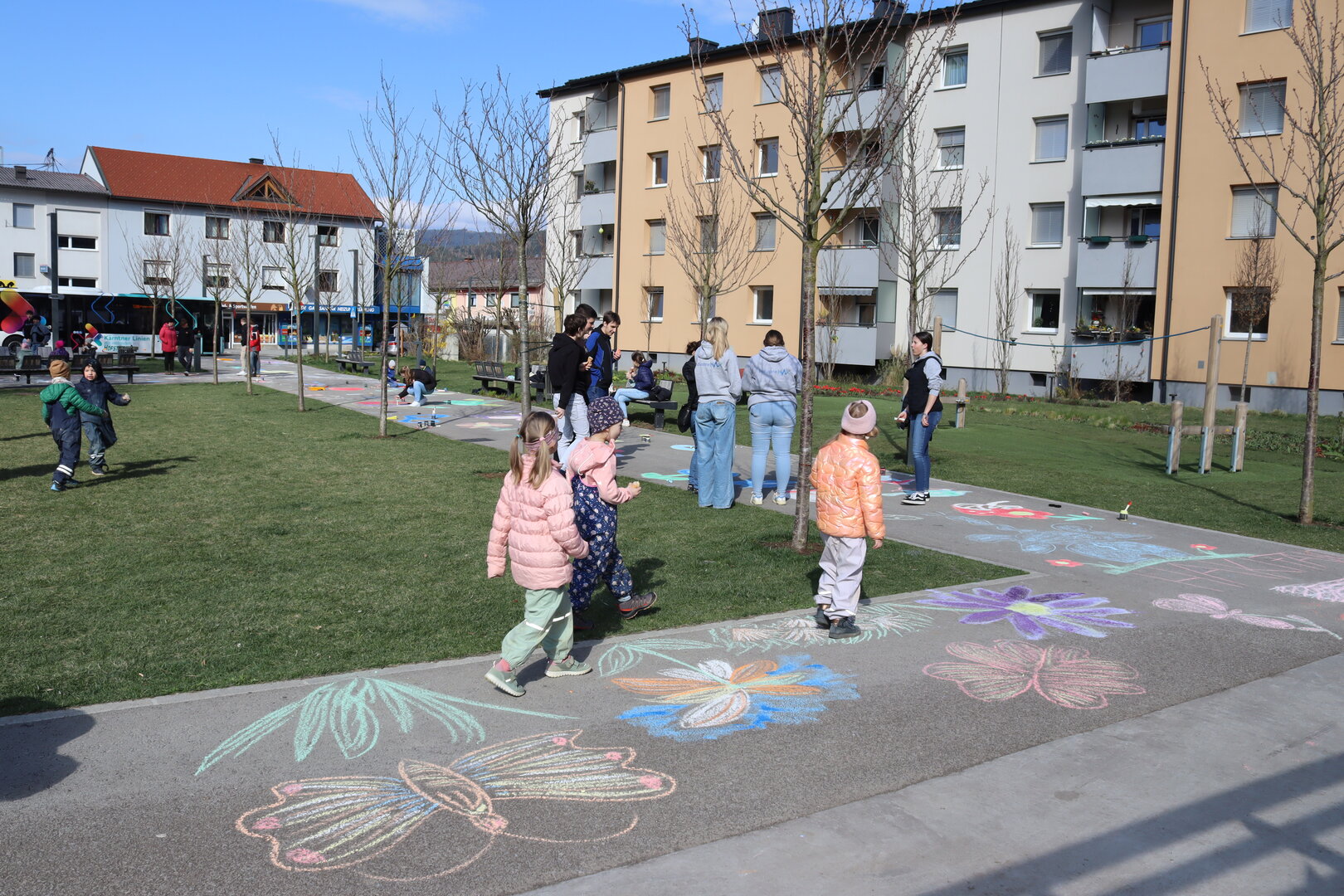 Im Stadtpark malten bei traumhaften Frühlingswetter Jugendliche der HAK Althofen sowie Kinder des Kindergartens Althofen wunderbare Kunstwerke auf den Asphalt. Umweltreferent Stadtrat Wolfgang Leitner und KEM-Manager Markus Löcker, die den „Tag des Zu-Fuß-gehens“ in Althofen organisiert hatten, beteiligten sich ebenfalls an der Schaffung von bunten Schmetterlingen, Ostereiern und vielem mehr. Zur Stärkung gab es für die begeisterten Malerinnen und Maler Krappfelder Eis der Familie Petra und Bernd Pobaschnig, Müsliriegel sowie Semmel. Mitgezeichnet haben unter anderem die Gemeinderäte Siegbert Schönfelder, Gernold Kloiber und Silvia Zeißler. Seht euch die „blühenden Wege“ im Stadtpark an, ihr werdet von den vielfältigen Zeichnungen begeistert sein!