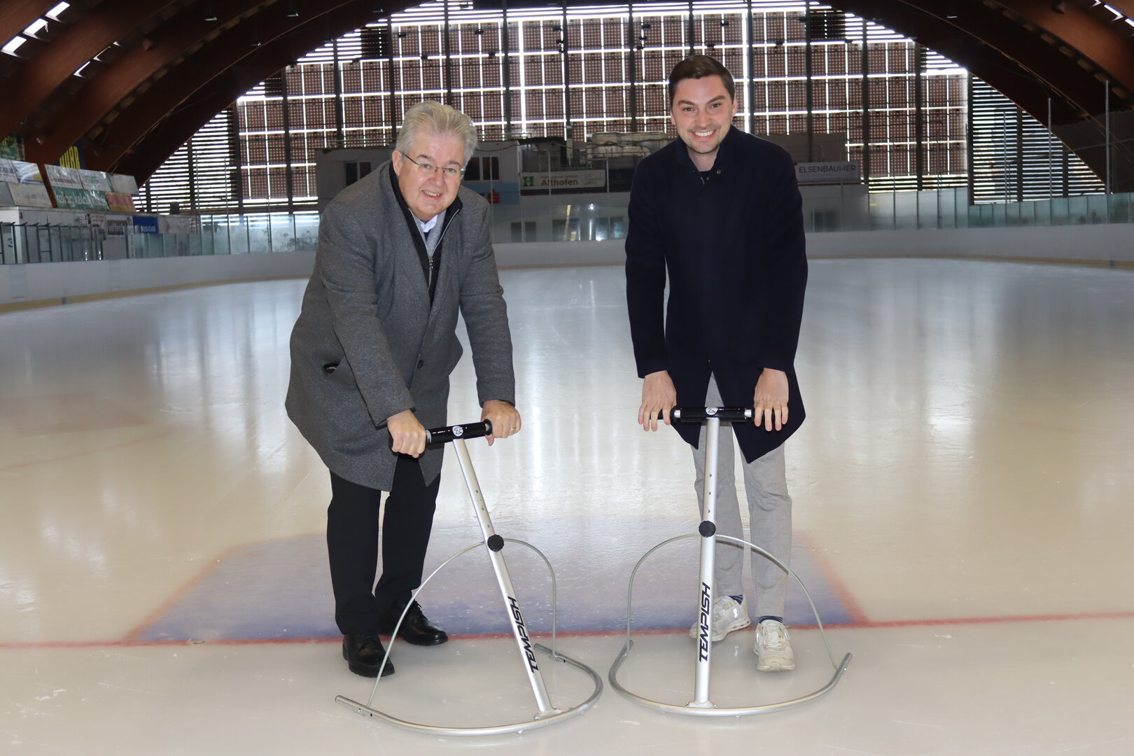 Seit Kurzem stehen in der Stadthalle Althofen sieben Eislaufhilfen zur Verfügung, die besonders Kindern und Anfängerinnen sowie Anfängern das spielerische Erlernen des Eislaufens erleichtern. Die Nutzung ist kostenlos möglich. Bürgermeister Walter Zemrosser und Sportstadtrat Philipp Strutz machten sich bereits selbst ein Bild und testeten die neuen Hilfsmittel auf dem Eis.