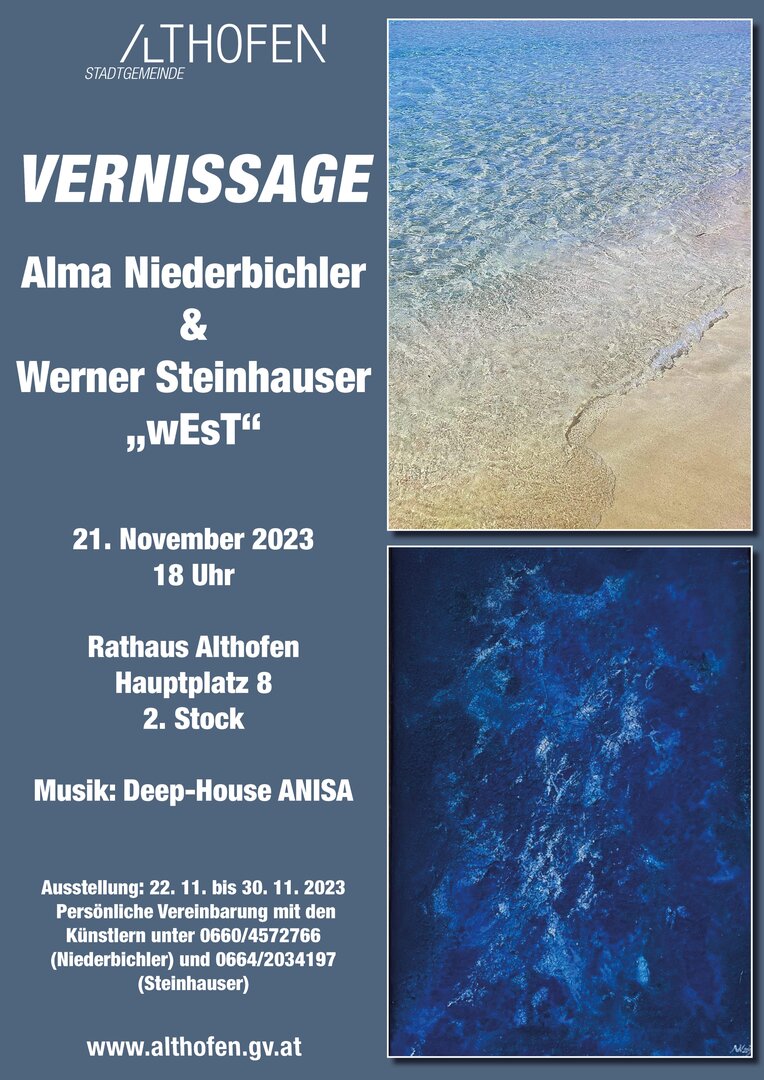 Die Vernissage findet am Dienstag, 21. November um 18 Uhr, im 2. Stock des Rathauses statt. Die Schwester von Alma Niederbichler, Anisa Vilic, begleitet mit House-Musik den Abend musikalisch. Die Ausstellung ist vom 22. bis einschließlich 30. November während der Öffnungszeiten des Rathauses, Montag bis Donnerstag jeweils 8 bis 16 Uhr sowie Freitag 8 bis 12 Uhr, zu besichtigen. Persönliche Führungen können mit Alma Niederbichler unter 0660/45 72 766 und Werner Steinhauser unter 0664/20 34 197 koordiniert werden.