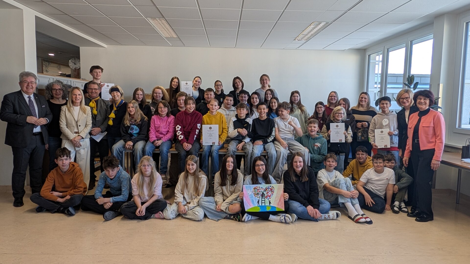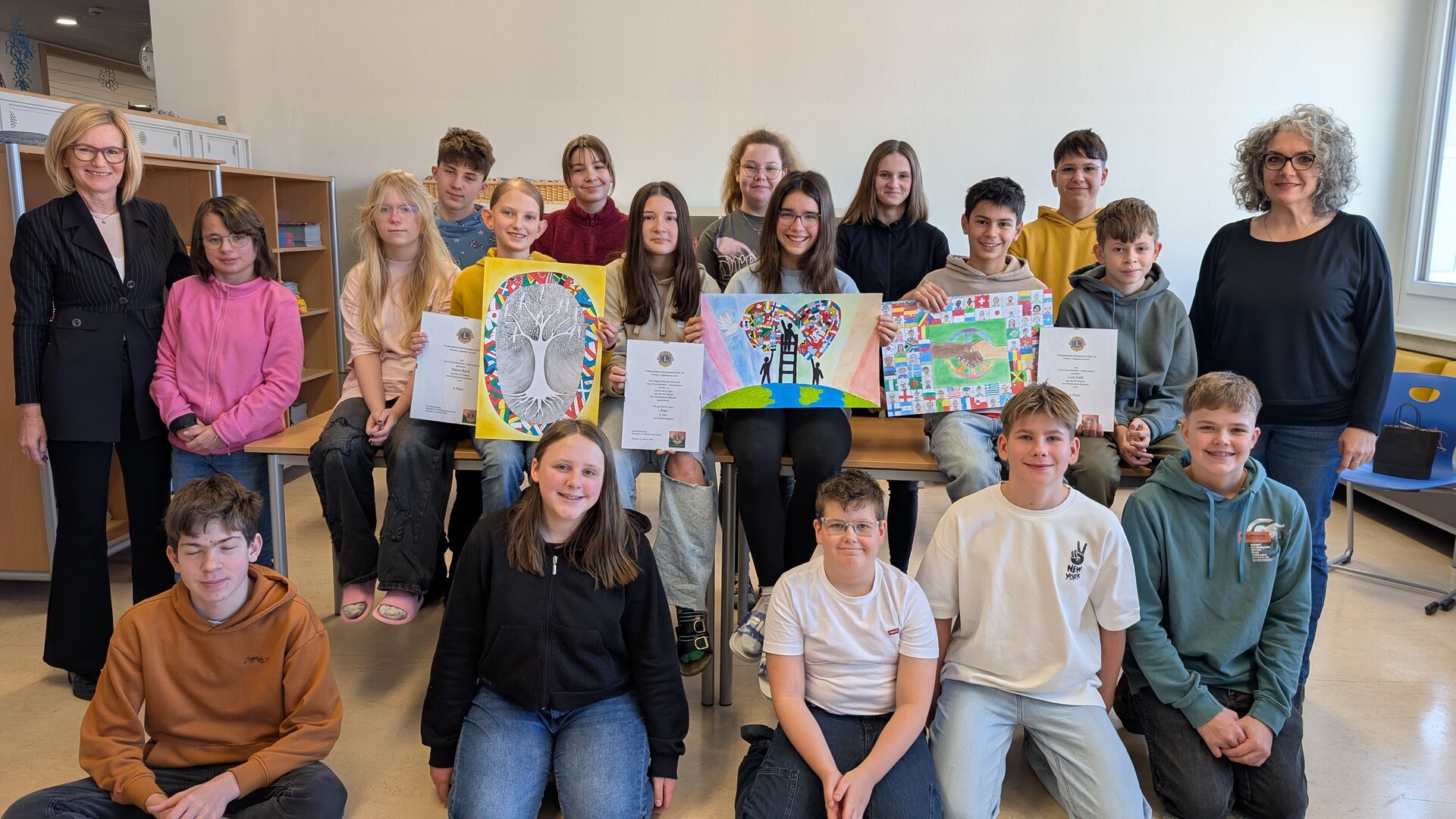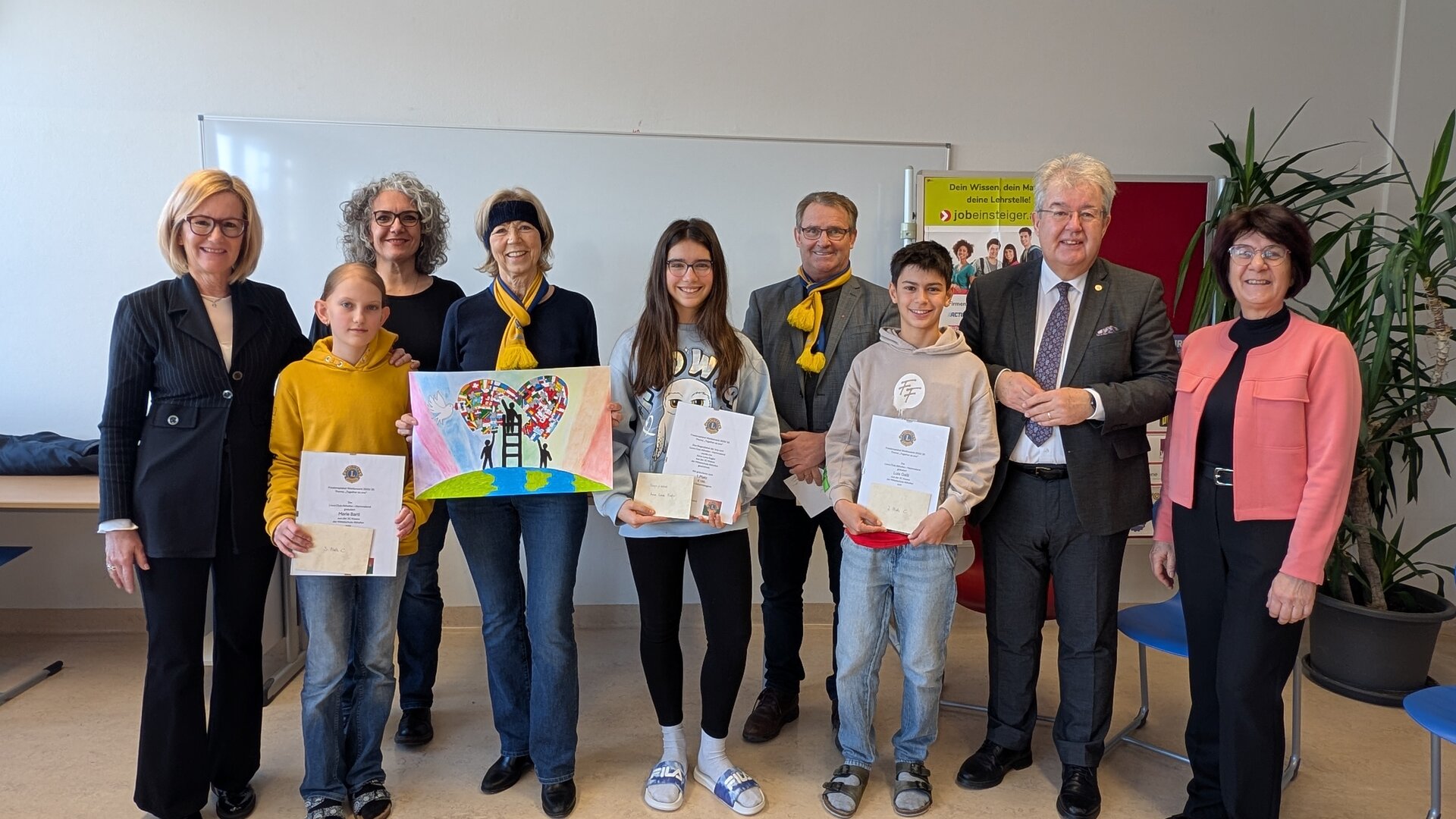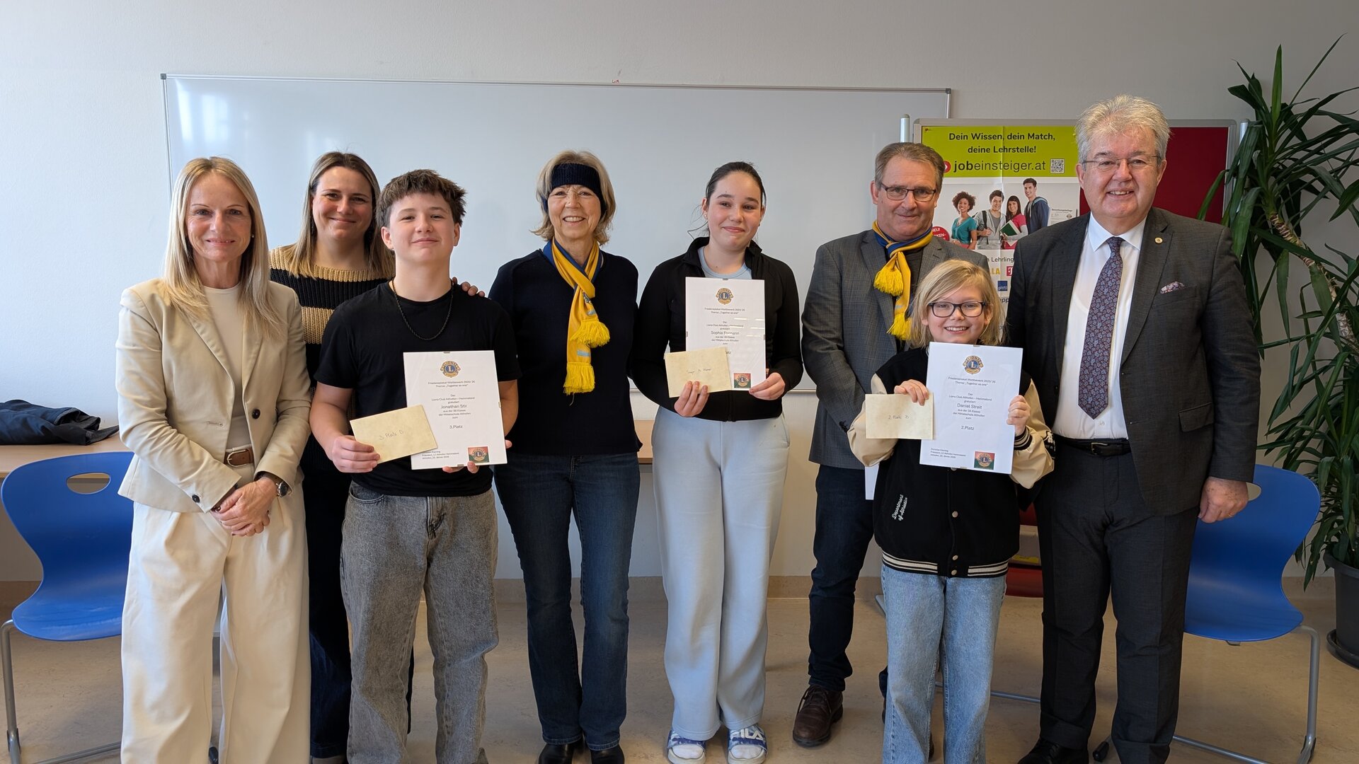 Die feierliche Preisverleihung fand im Beisein von Bürgermeister Walter Zemrosser, Lions-Präsident Christian Klaming, Past-Präsidentin Ingrid Bachler, Schulleiter-Stellvertreterin Sabine Ratheiser sowie den Pädagoginnen Jaqueline Neubauer, Angelika Zedrosser, Bettina Steiner-Köferle und Birgit Welik an der Mittelschule Althofen statt. Ausgezeichnet wurden Luis Gölli-Farassat, Marie Bartl, Sophia Formann, Jonathan Stir und Daniel Streit aus den Klassen 3B und 3C, die mit außergewöhnlich gelungenen Zeichnungen die Themen Zusammenhalt, Miteinander und Hoffnung auf Papier brachten. Als Gesamtsiegerin ging Anna-Lena Kogler aus der Klasse 3C hervor, deren Werk die Jury besonders begeisterte. Als Zeichen der Anerkennung überreichten die Stadtgemeinde Althofen und der Lions Club Althofen Hemmaland den Preisträgerinnen und Preisträgern sowie den beteiligten Klassen eine finanzielle Unterstützung.