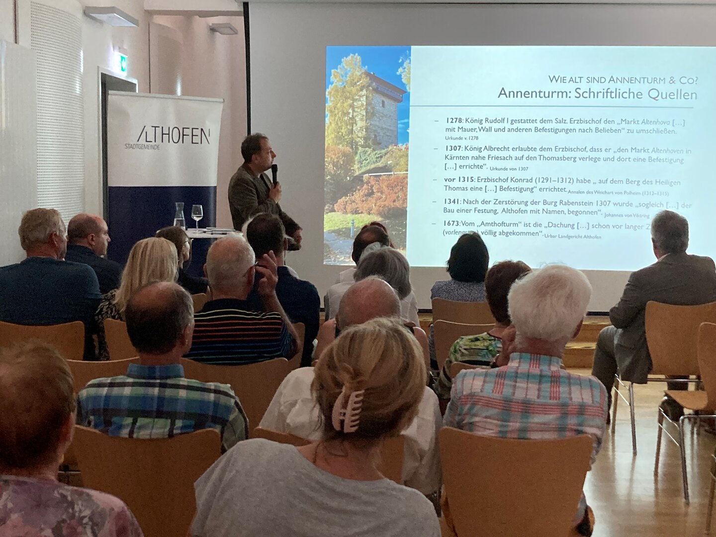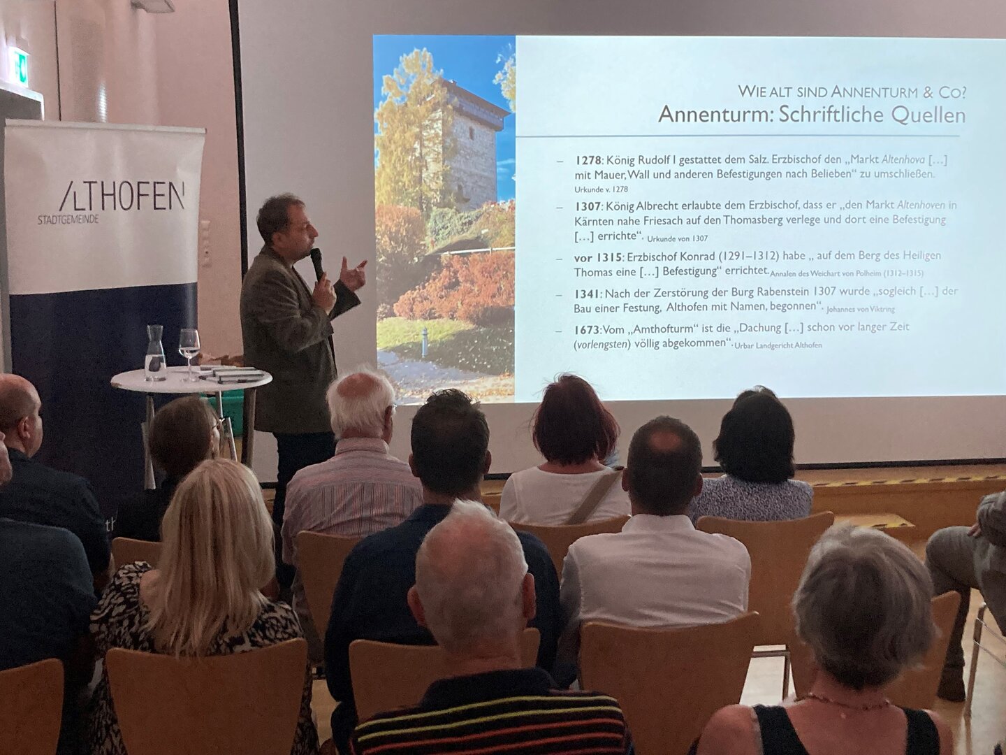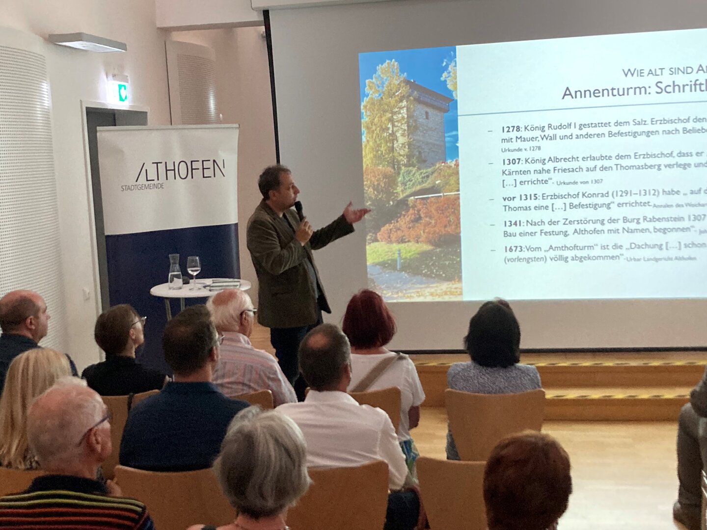 Vergangenen Donnerstag fand im Hemmalandsaal der Musikschule die Buchpräsentation mit dem Vortrag von Jannach zum Thema „Wie alt sind Annenturm & Co.? – Zur Baualterbestimmung ausgewählter Sehenswürdigkeiten der Stadtgemeinde Althofen“ statt. In die Geschichte Althofens tauchten neben Bürgermeister Walter Zemrosser, Vize-Bürgermeisterin Doris Hofstätter und Gemeinderätin Corina Spendier unter anderem auch Stadtarchiv-Obfrau Inge Lebl, Manfred Mitterdorfer, Alt-Bürgermeister und Ehrenbürger der Stadt Althofen, Althofen-Expertin Elfriede Wassertheurer und Bed & Breakfast-Chefin Birgit Schneider-Kraßnitzer ein.
