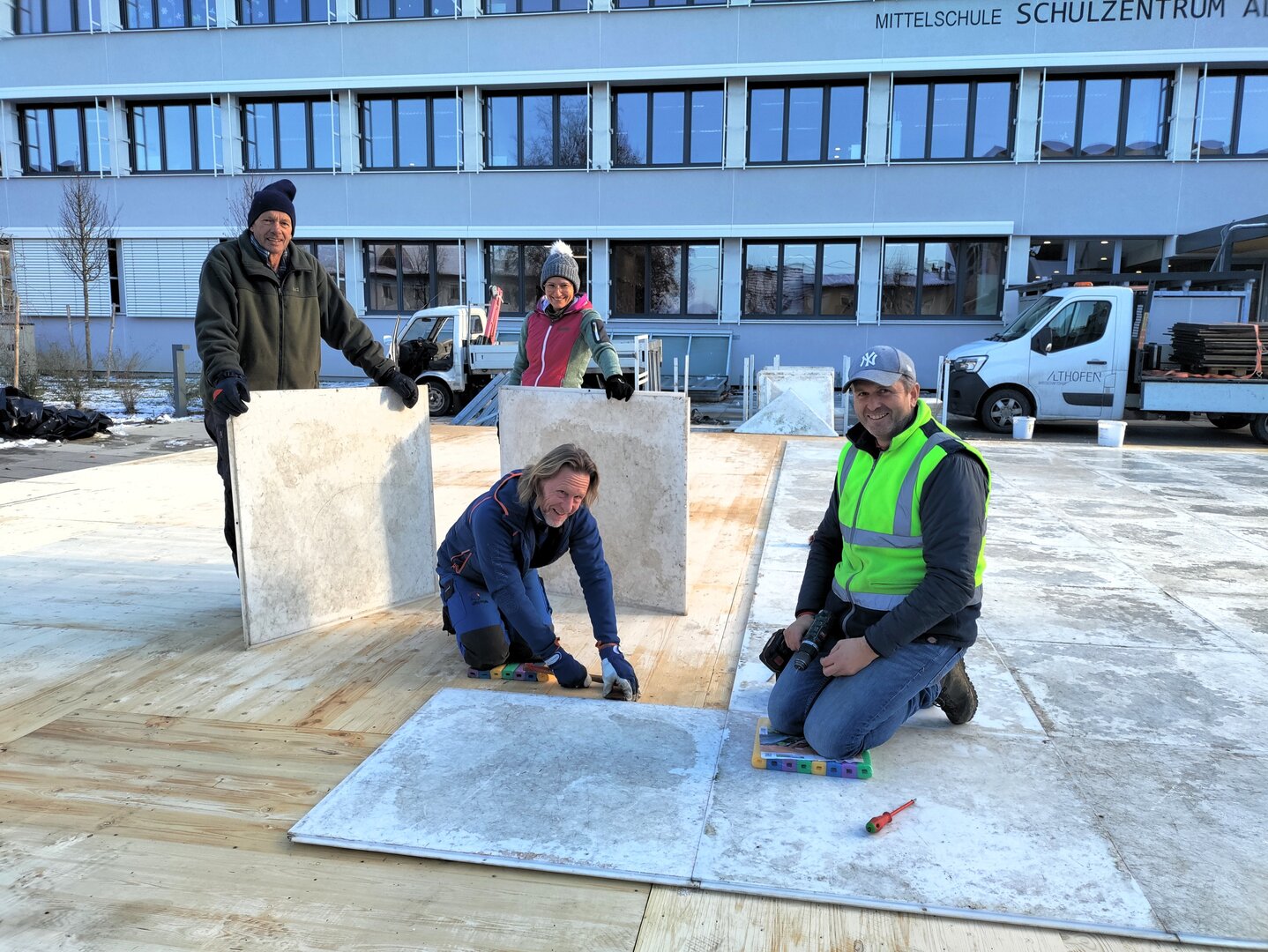 Helmut Wallner, Nadin Pirker und Wilfried Fritz, Mitarbeiter des Wirtschaftshofes, stellen aktuell gemeinsam mit Bernd Lampichler den großen Eislaufplatz im Stadtpark auf. Das Besondere daran: Der Kunsteislaufplatz besteht aus speziellen Platten, das Schlittschuhfahren ist temperaturunabhängig und es entstehen keine Energie- oder Wasserkosten.