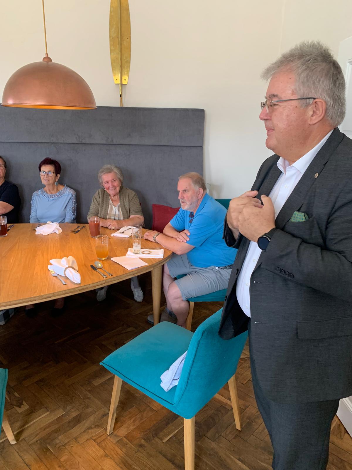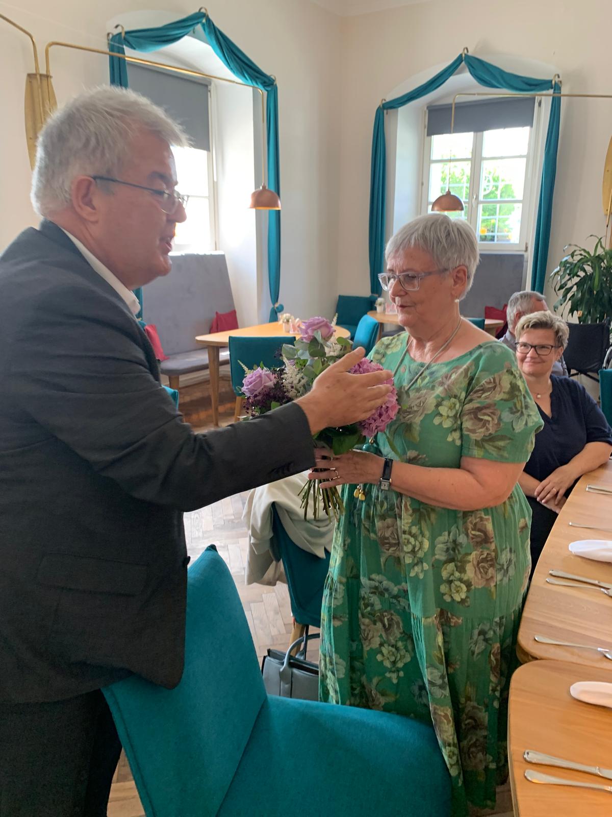 Am Tag der Essenseinladung feierte Karin Schibich ihren 70. Geburtstag. Sie erhielt an ihrem Ehrentag einen Blumenstrauß aus den Händen des Bürgermeisters.