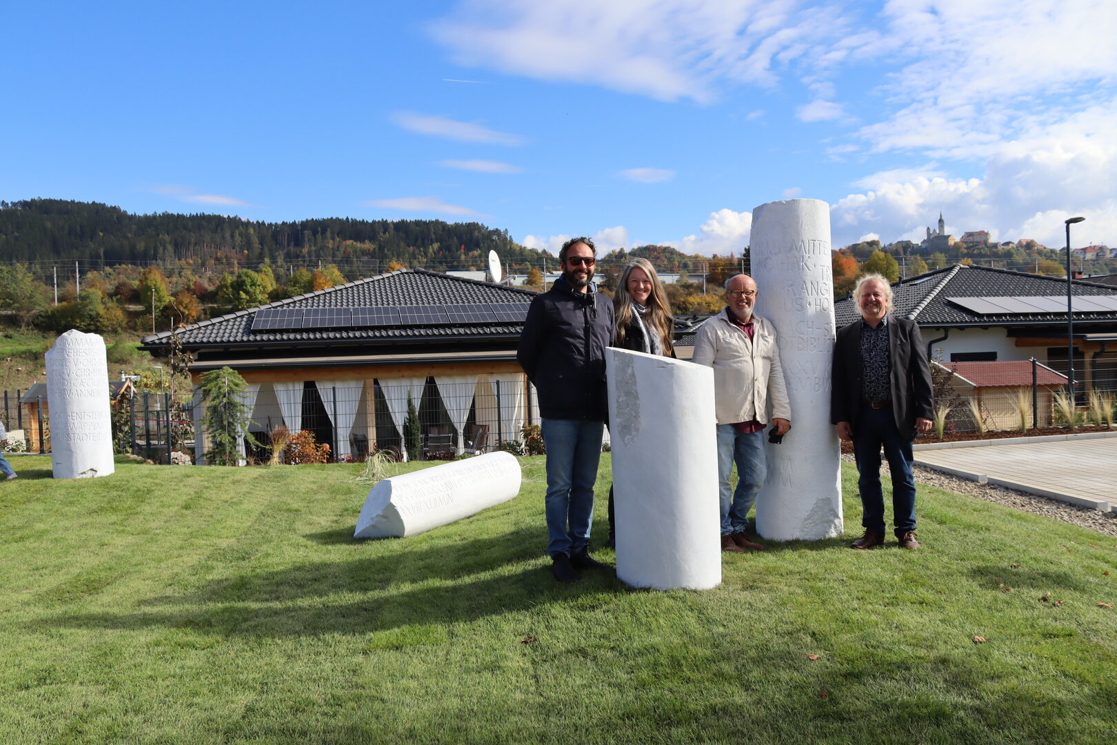 Im Rahmen der Eröffnungsfeier wurde auch das Kunstprojekt „Meilensteine“ vorgestellt, das im Zuge der Internationalen Bildhauersymposien 2024 und 2025 entstand. Der Vorplatz der Kinderbetreuungseinrichtung wurde von den Künstlern Romana Egartner, Andres Klimbacher, Jure Markota und Helmut Machhammer gestaltet. „In Krumfelden wurde ein Römerstein gefunden – das inspirierte uns, ein Ensemble aus ‚Römersteinen‘ zu schaffen“, erklärte Bildhauer Helmut Machhammer. Insgesamt sieben Skulpturen aus Krastaler Marmor, bis zu 2,20 Meter hoch, zieren nun den Vorplatz. Jede ist mit individuellen Inschriften versehen – von lateinischen Zitaten bis zu humorvollen Texten –, insgesamt 1.200 Buchstaben wurden eingemeißelt.