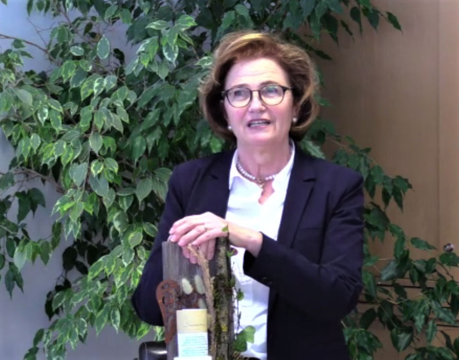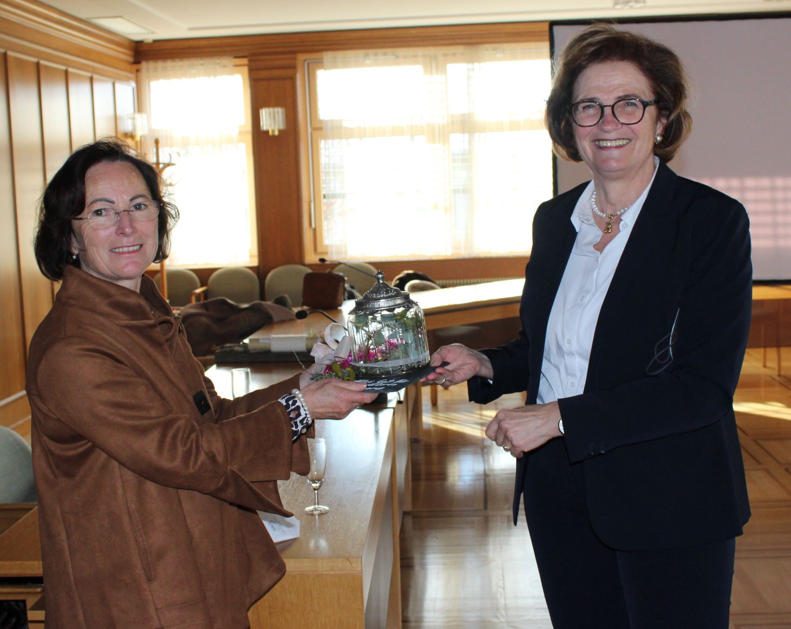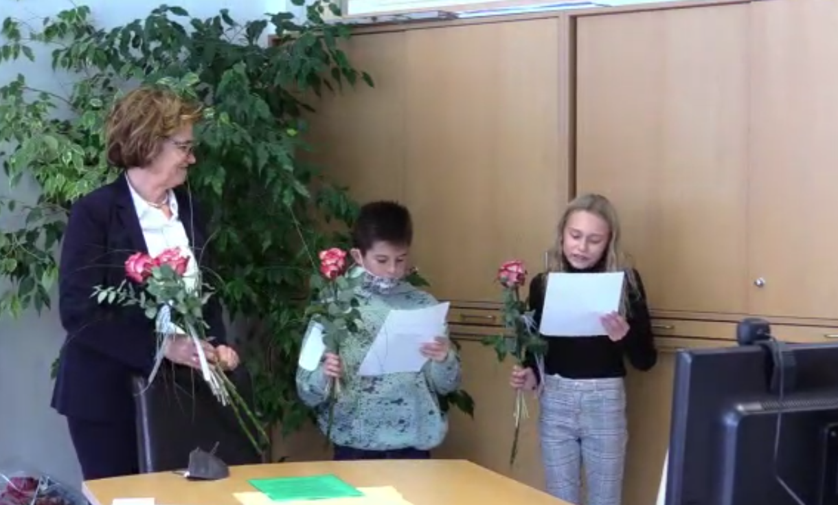 Der Schulchor wurde zur virtuellen Feierstunde per Video zugespielt. Laurel und Lina überechten stellvertretend für alle Schülerinnen und Schüler Blumen, Sabine Ratheiser übergab ein Geschenk der Kollegenschaft.