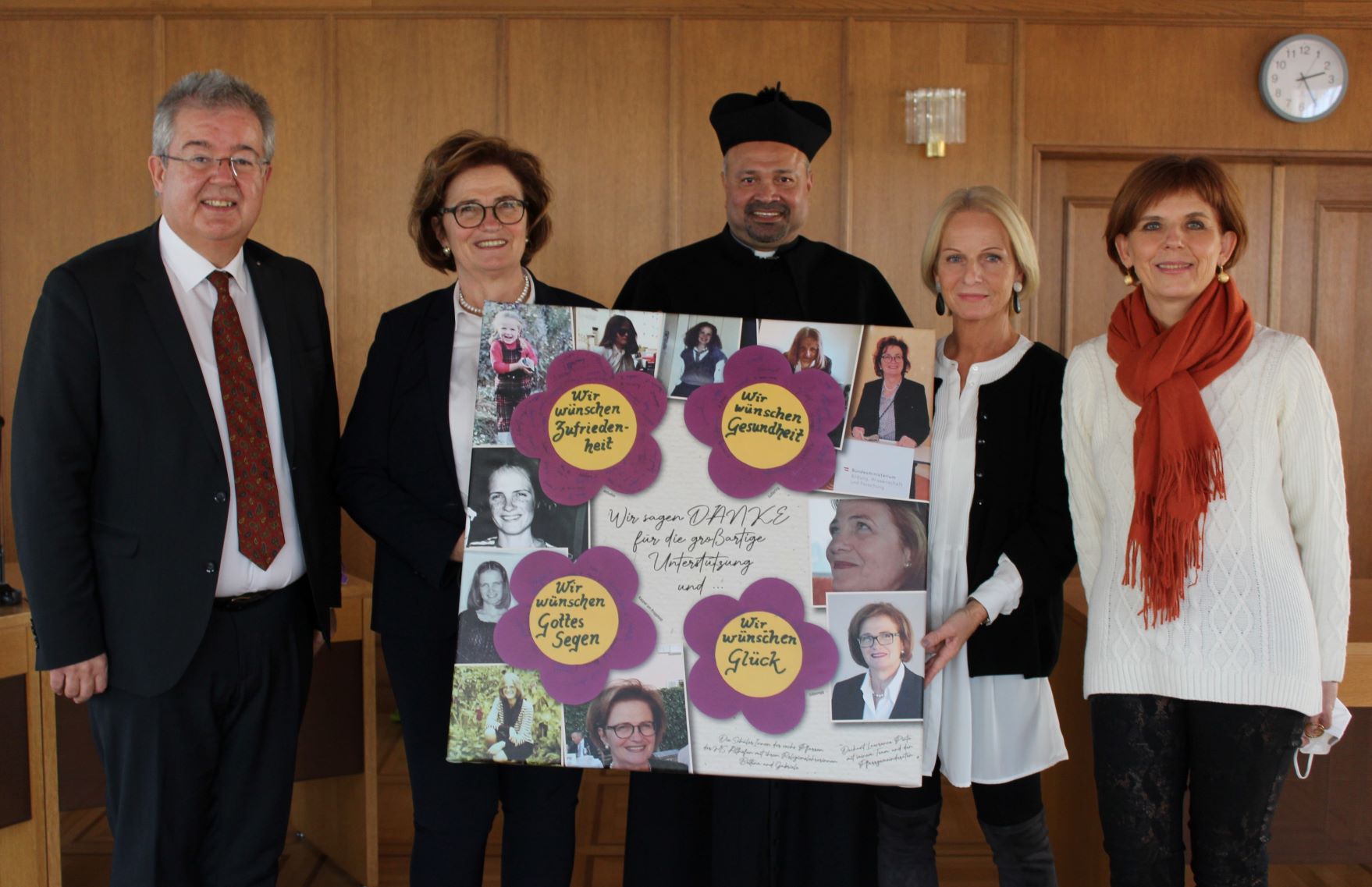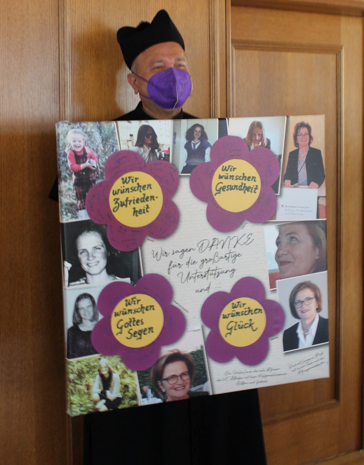 Dechant Lawrence Pinto wünschte mit einer wunderbaren Collage, die Religionslehrerinnen Gabriele Peball und Bettina Steiner-Köferle in Zusammenarbeit mit Schülerinnen und Schülern kreierten, alles Gute für den Ruhestand. Seitens der Stadtgemeinde dankten Bürgermeister Walter Zemrosser und Vize-Bürgermeisterin Doris Hofstätter für das jahrzehntelange Engagement im Schulbereich und hießen gleichzeitig das neue Leiter-Team willkommen. Ebenfalls in den Ruhestand verabschiedet wurde nach über vierzig Jahren Lehrtätigkeit Gertraud Pirolt.