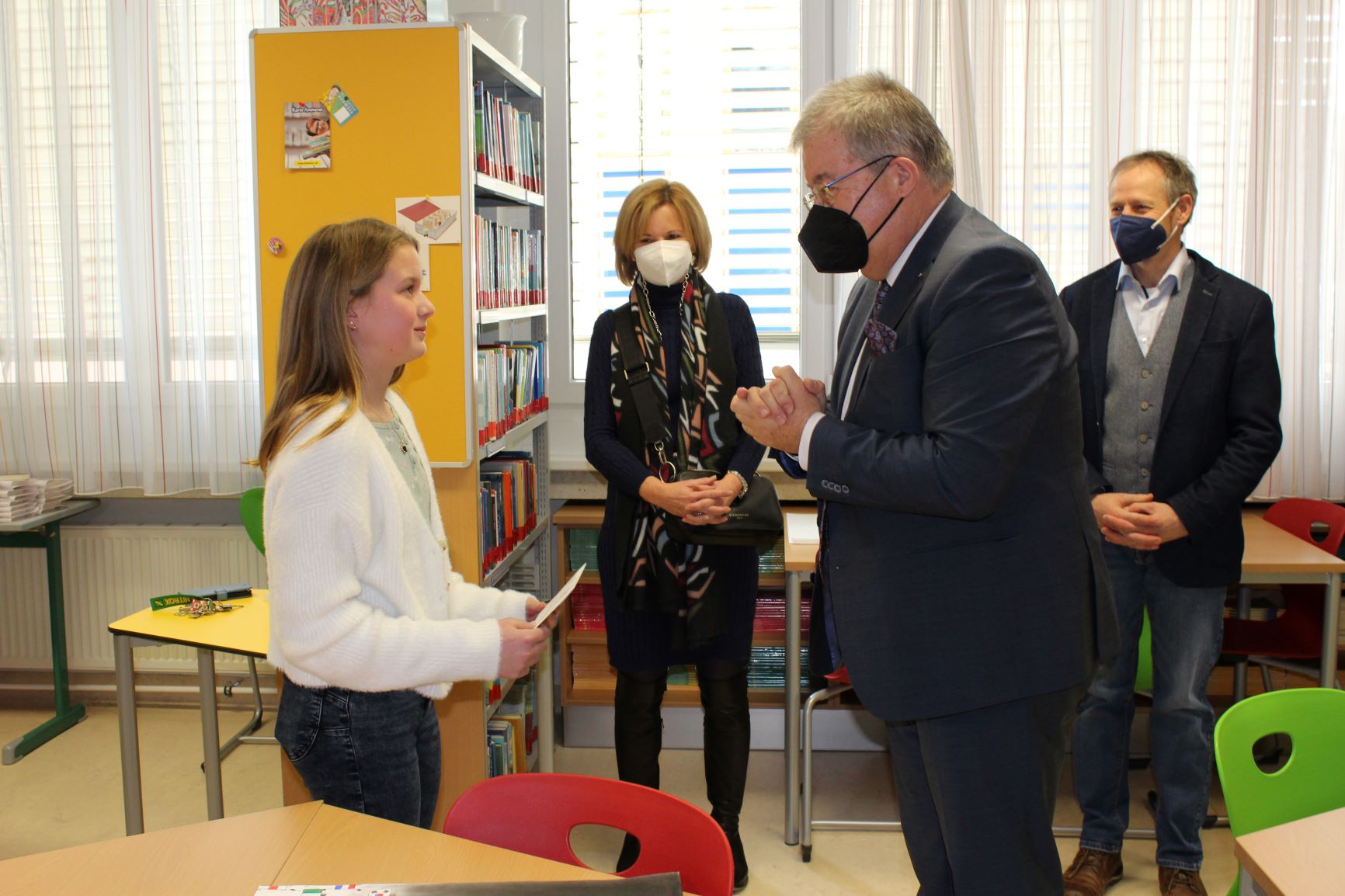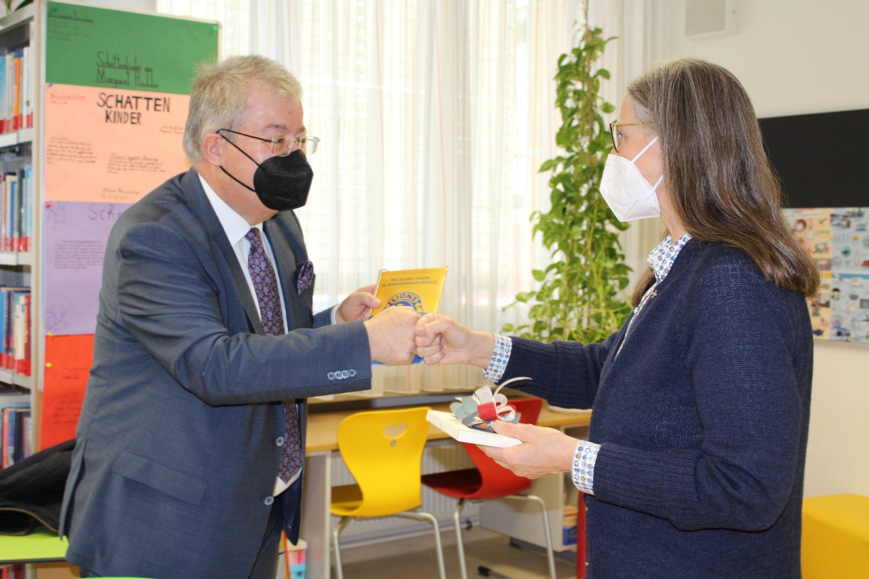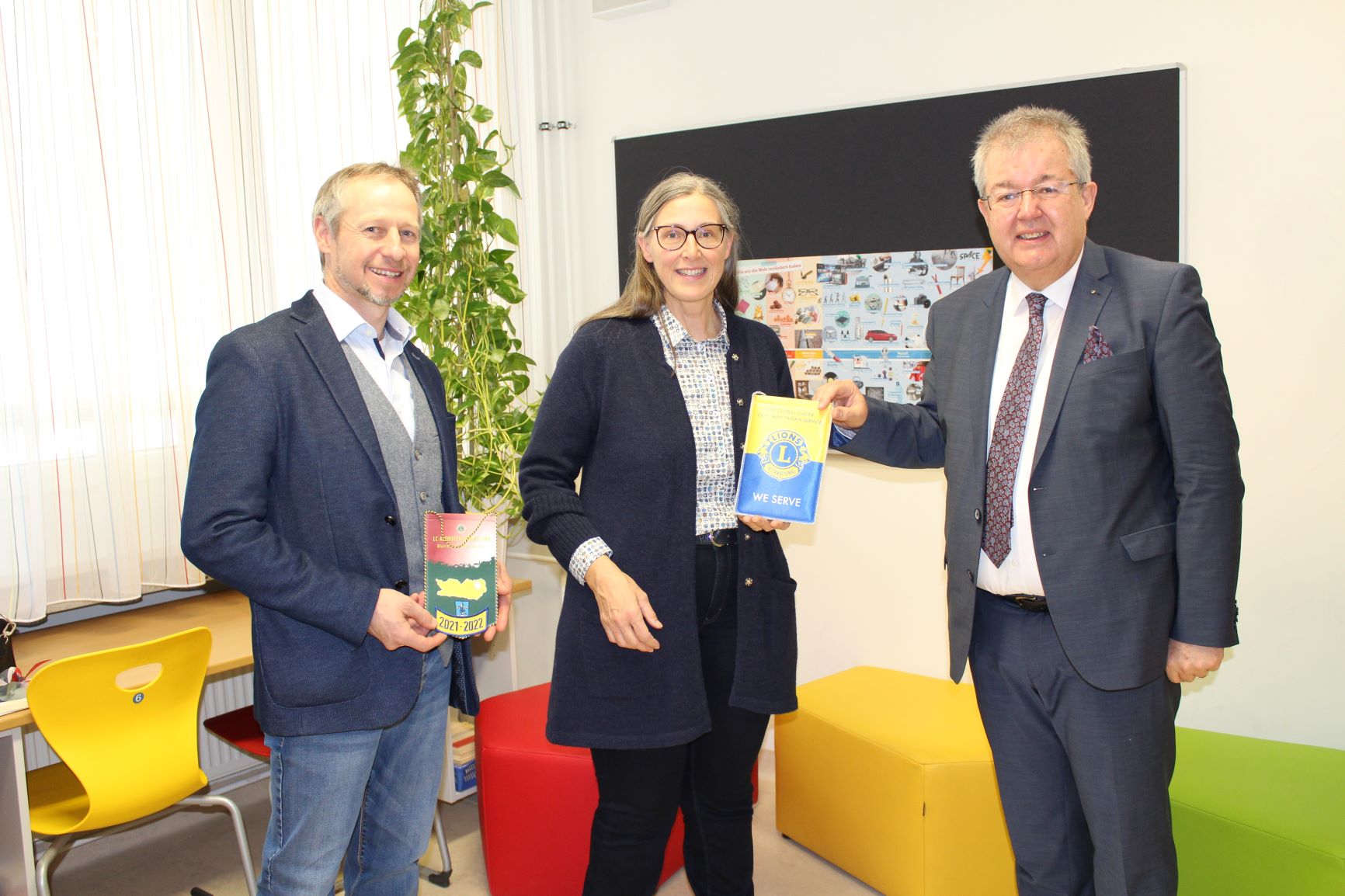 Der Bürgermeister der Stadtgemeinde Althofen stellt sich bei den vier Preisträgern mit einer namhaften Geldspende ein. 200 Euro für die Klassenkasse übergab Helmut Wachernig, Präsident des Lionsclubs Althofen-Hemmaland. Zudem überreichte Bürgermeister Zemrosser Schulleiterin Egger den Lions-Wimpel. Die vier Kunstwerke von Emilia, Lilly, Smila und Fabian sind ab sofort prominent in der Mittelschule Althofen platziert.