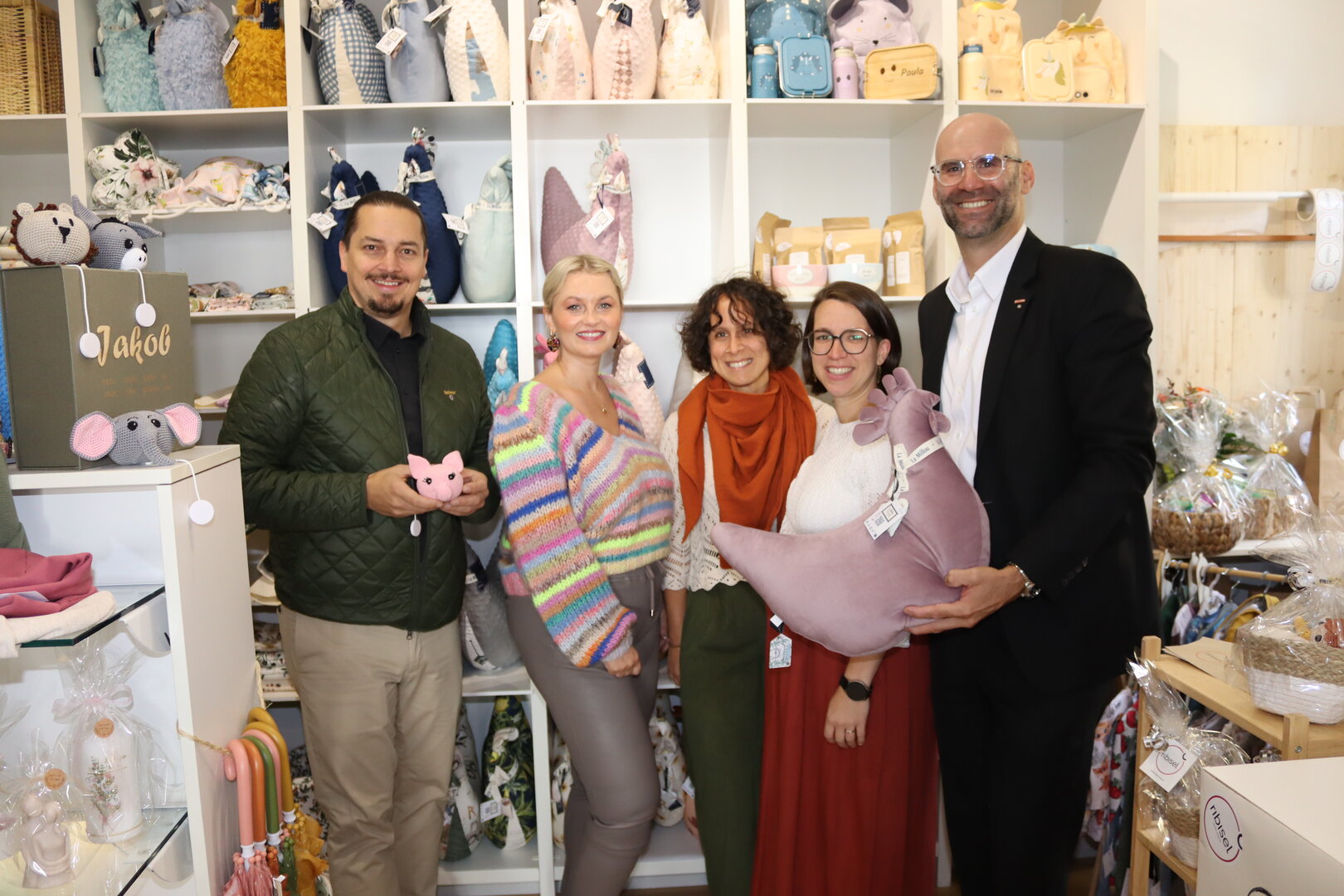 Die Jungunternehmerinnen Simone Unterberger und Isolde Reinbold, Gewinnerinnen des diesjährigen Pop-up-Store-Wettbewerbs, erhielten zur Eröffnung die besten Glückwünsche von Wirtschaftskammer-Bezirksstellenleiter Robert Schratt, WK-Bezirksobmann Walter Sabitzer und Junge Wirtschaft-Bezirksvorsitzender Anamaria Gassinger.