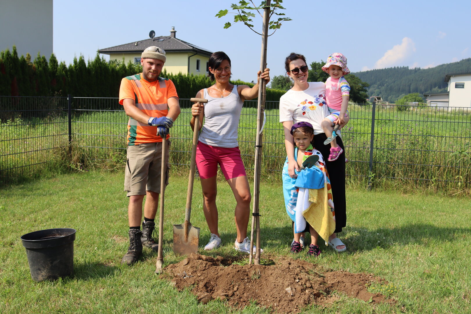 Nadin Pirker und Jason Stary vom Althofener Wirtschaftshof pflanzten die Bäume. Unterstützt wurden sie dabei von den Kindern, die begeistert mithalfen. Sie buddelten mit ihren Schaufeln Löcher und halfen beim Einfüllen der Erde.