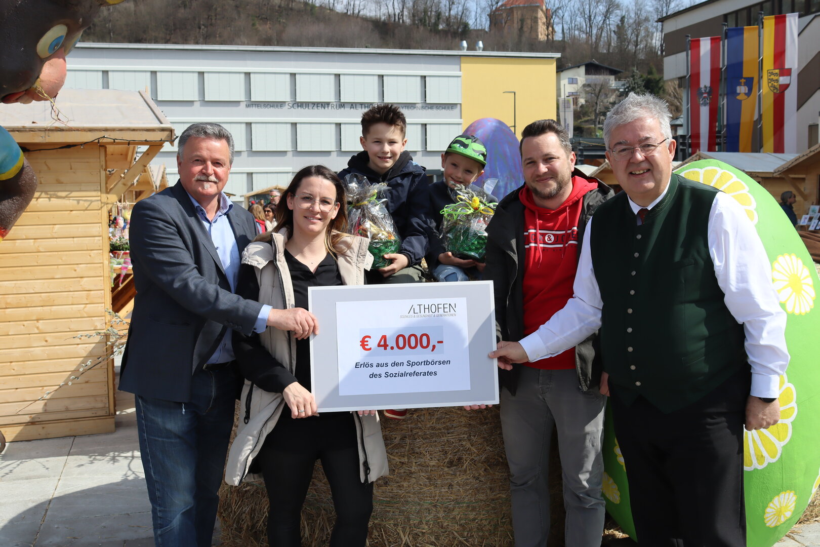 Im vergangenen November organisierte das Sozialreferat der Stadtgemeinde Althofen die Wintersportbörse, gefolgt von der Rad- und Sommersportbörse Anfang März dieses Jahres. Der Erlös aus den einbehaltenen Unkostenbeiträgen dieser Veranstaltungen kommt nun dem krebskranken Dominik Mucher zugute. Sozialreferent Stadtrat Klaus Trampitsch (SPÖ) übergab vor Kurzem im Beisein von Bürgermeister Walter Zemrosser den namhaften Betrag von 4.000 Euro an die Eltern des tapferen Jungen, Nadja und David Mucher.