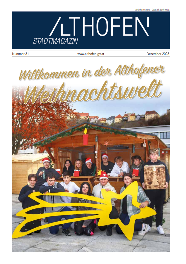 Viele Neuigkeiten, interessante Berichte der Vereine und Schulen, ein umfangreicher Terminkalender und vieles mehr erwarten euch in dieser Adventausgabe. Außerdem finden Sie das gesamte Programm der Althofener Weihnachtswelt im Stadtmagazin. Wir wünschen Ihnen viel beim Lesen!
