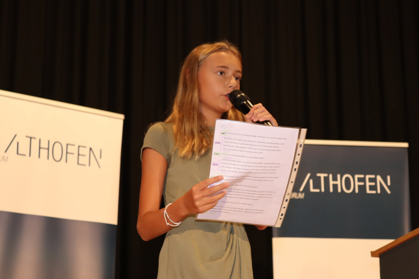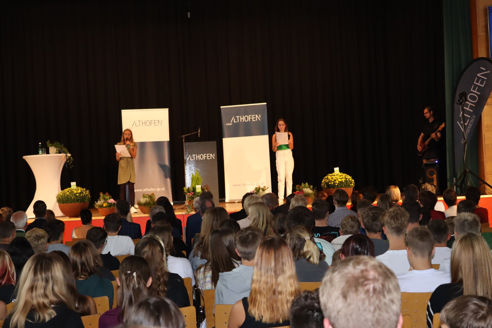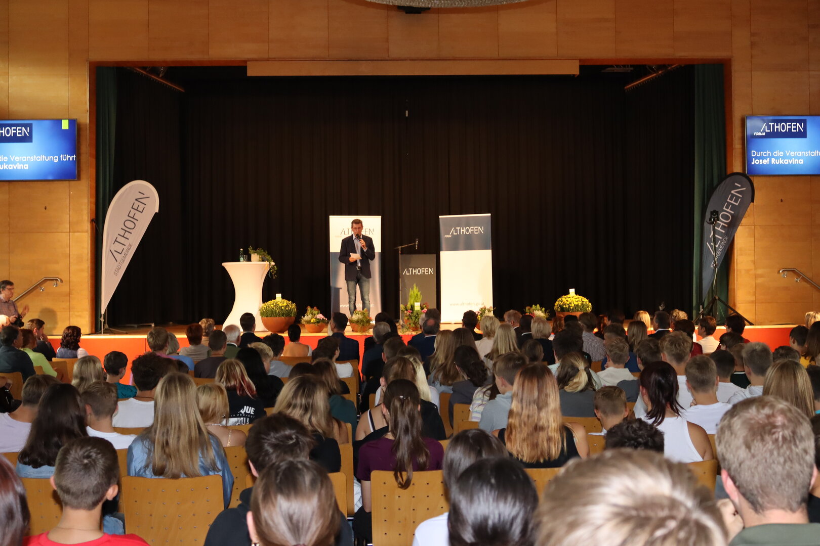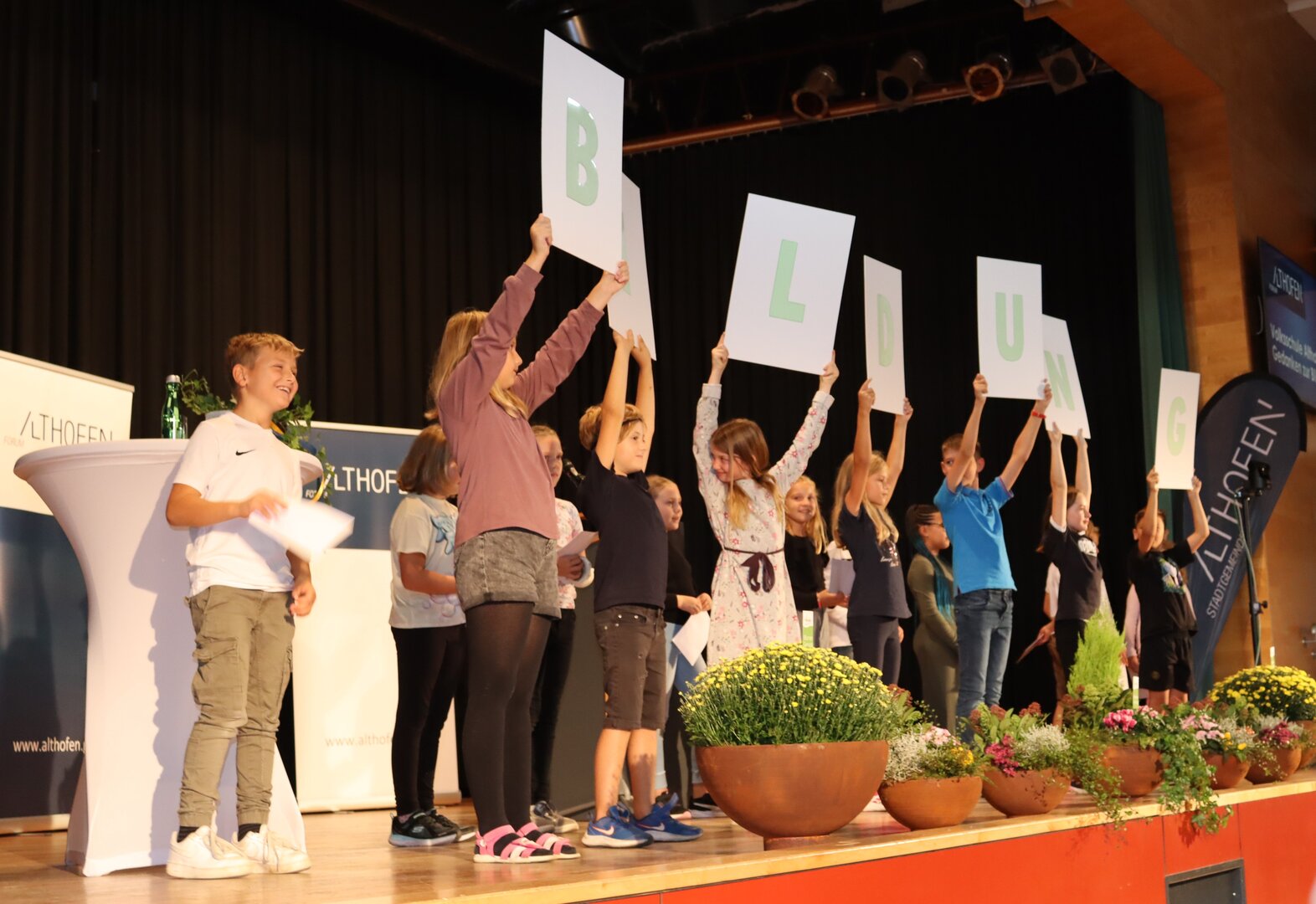 Auch die Althofener Schulen waren in das Forum Althofen eingebunden. Mit Songs der Band des BORG „Auer von Welsbach“, Leitung Peter Prammerdorfer, startete das Symposium. Nach einem humorvollen wie nachdenklichen Beitrag der vierten Klassen der Volksschule Althofen präsentierte die Mittelschule Althofen das Fastentuch-Projekt „Worunter Kinder leiden“. Es herrschte Stille im Saal, als von Schülerinnen und Schülern verfasste, unter die Haut gehende Texte über Gewalt, Rassismus oder Trauer vorgetragen wurden. Unter dem Titel „Voice of Education“ brachte die HAK Althofen einen wertvollen Beitrag. Schülerinnen und Schüler der Landwirtschaftlichen Fachschule Althofen versorgten professionell die Gäste mit Erfrischungen.