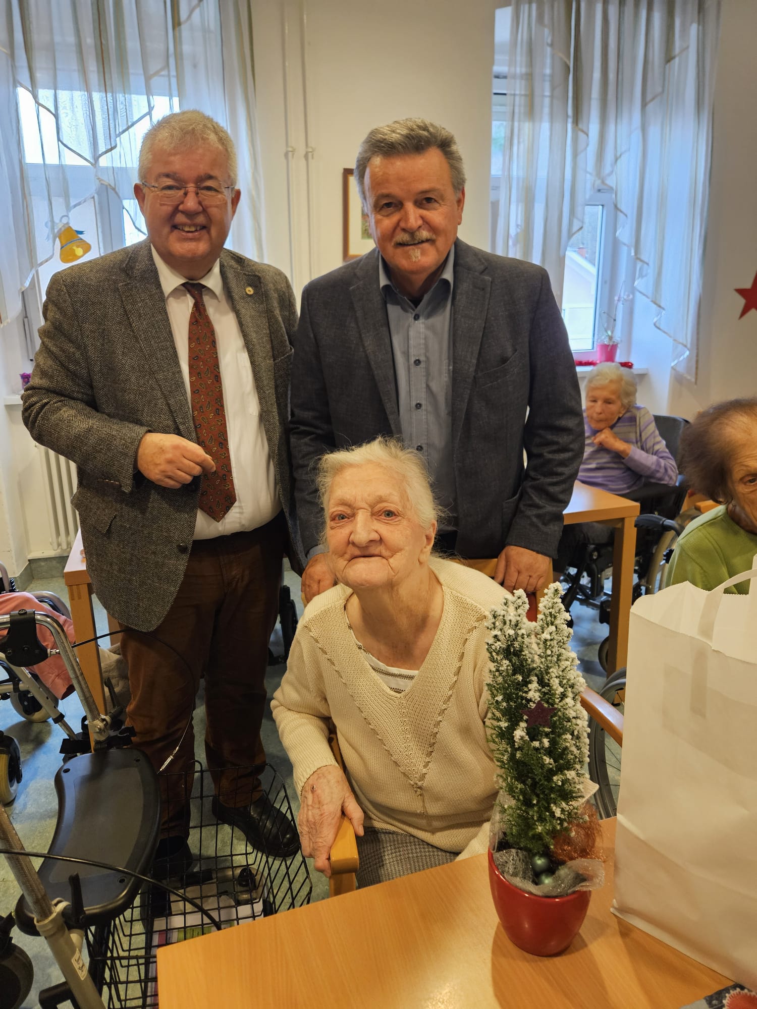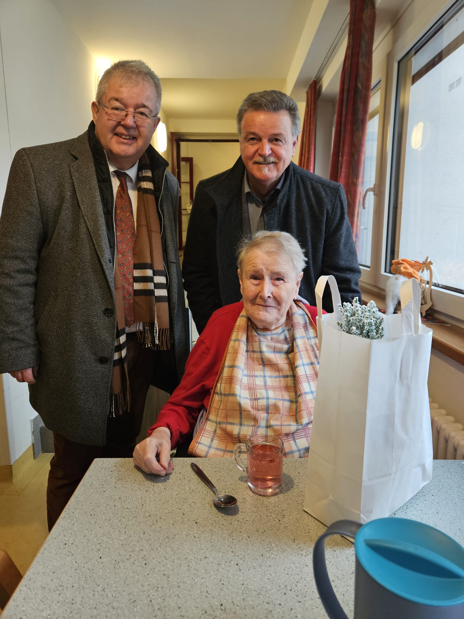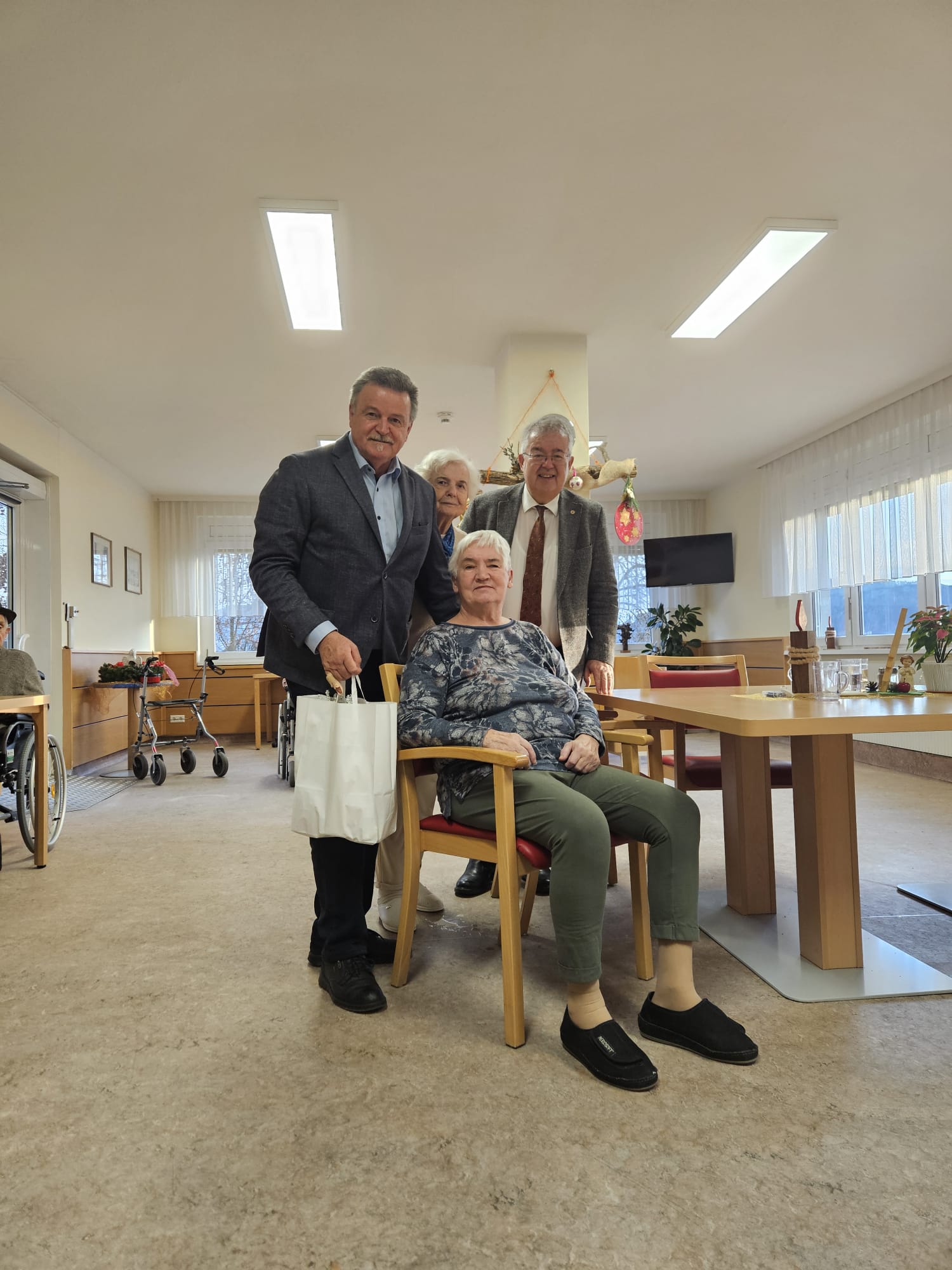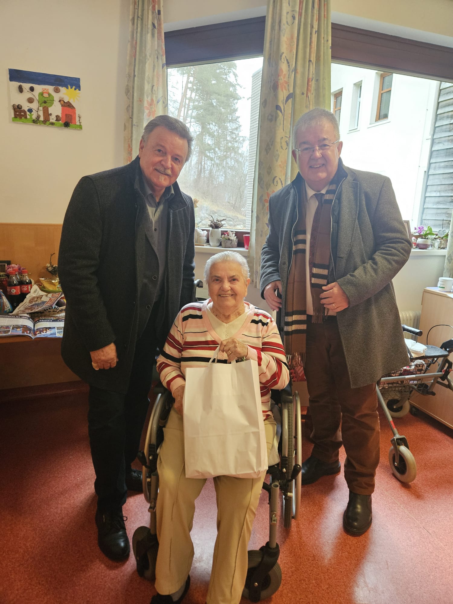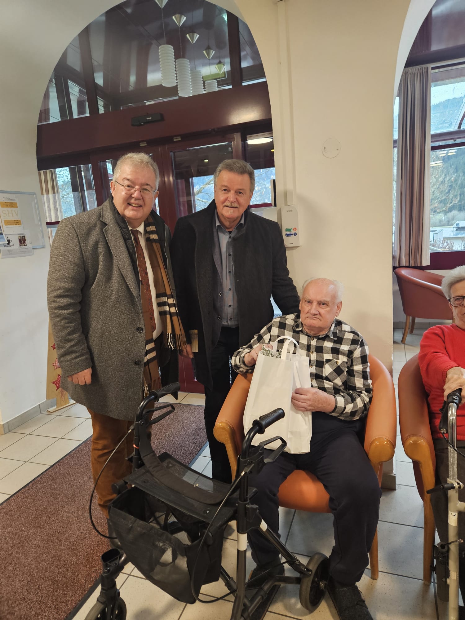 Eine schöne Weihnachtsaktion des Sozialreferenten der Stadtgemeinde Althofen: Sozialstadtrat Klaus Trampitsch besuchte wie jedes Jahr kurz vor dem Fest ehemalige Bewohnerinnen und Bewohner Althofens, die inzwischen in umliegenden Pflegeheimen leben – heuer in Begleitung von Bürgermeister Walter Zemrosser. Mehr als 40 Personen freuten sich über liebevoll überbrachte Weihnachtsgrüße und über ein kleines Geschenk in Form von Keksen, Honig und einer kleinen Zimmertanne. Persönliche Gespräche machten den Besuch zu etwas Besonderem.