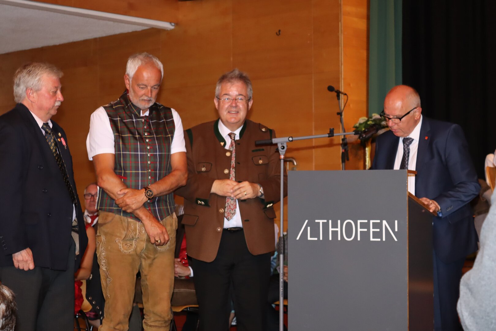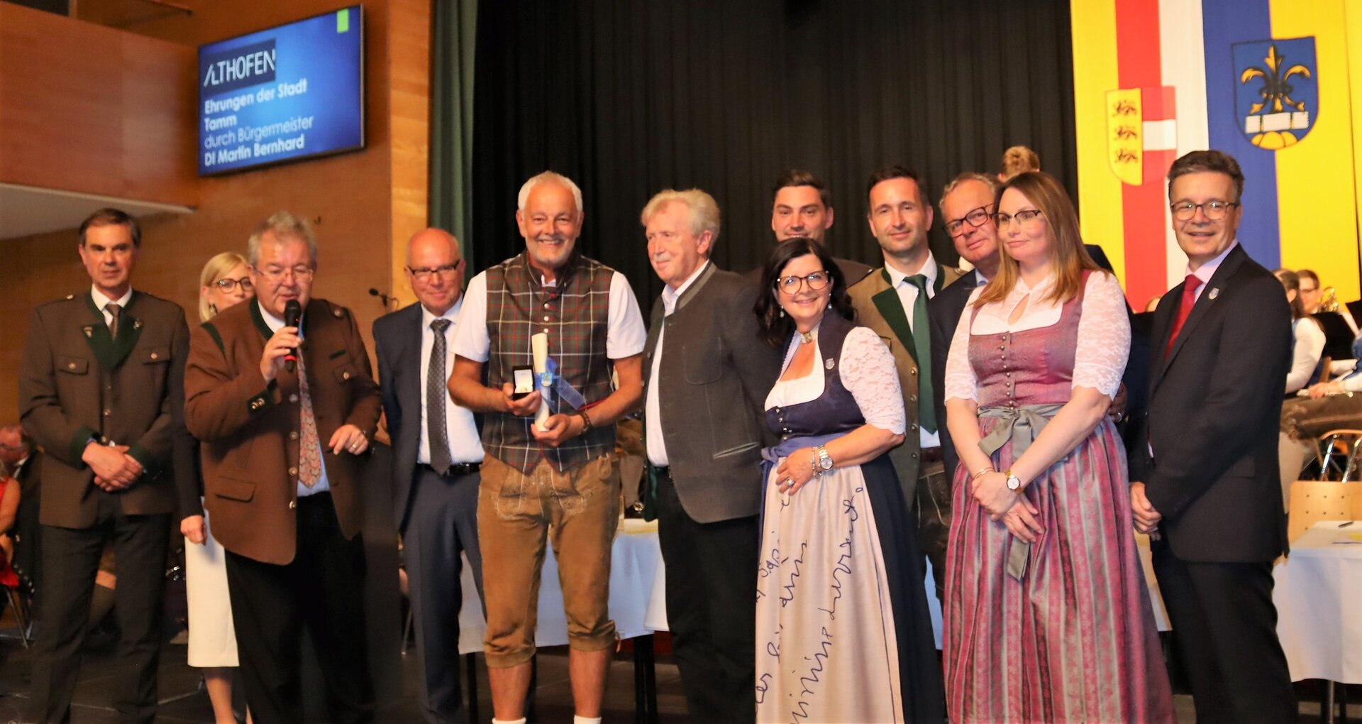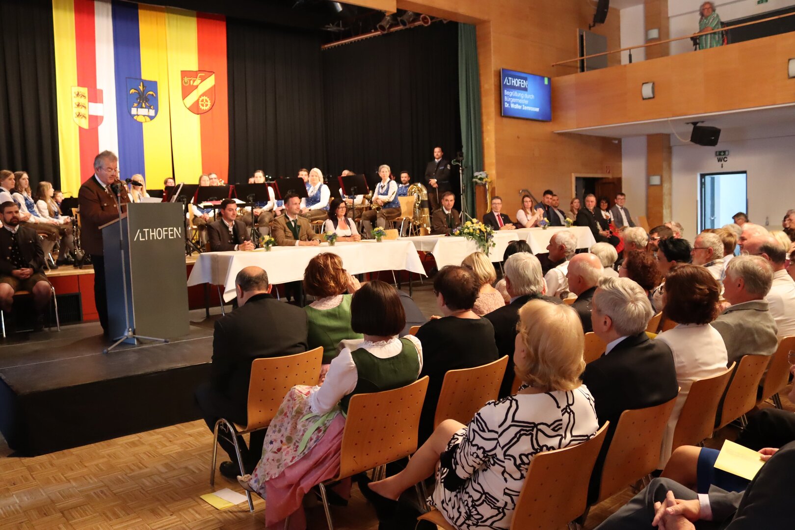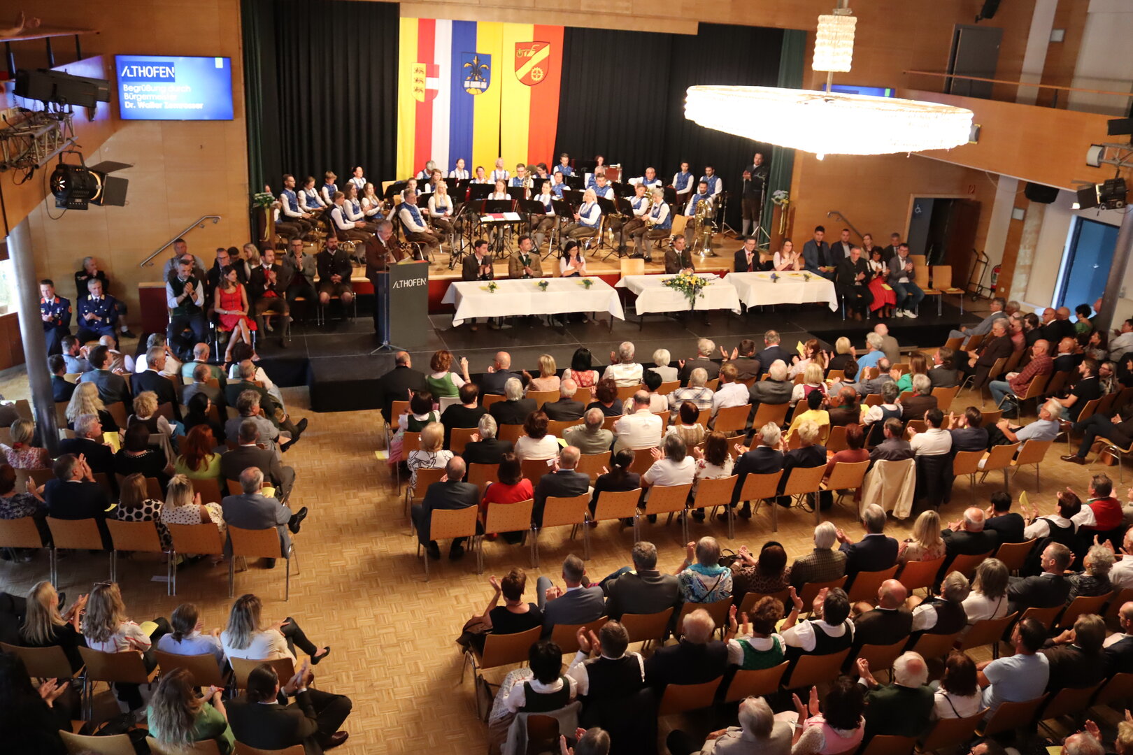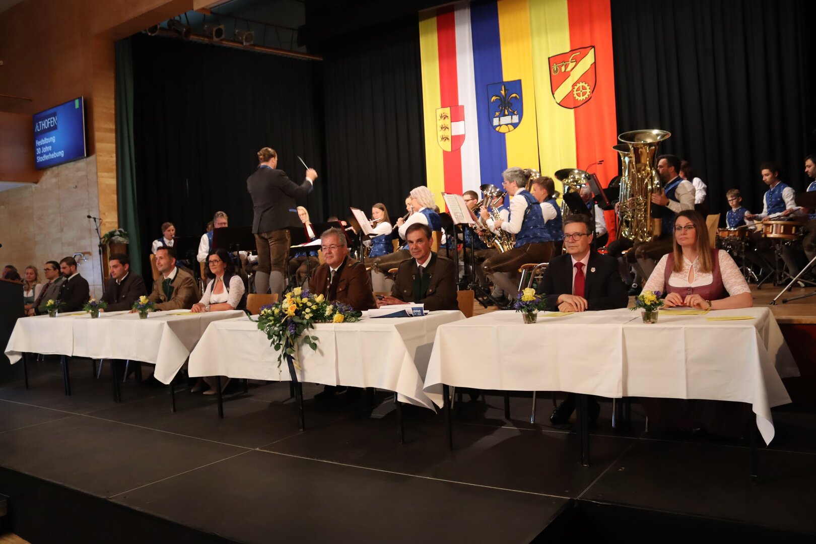 Vorne am Podium Platz genommen haben neben Bürgermeister Walter Zemrosser auch die Vize-Bürgermeister Doris Hofstätter und Michael Baumgartner, die Stadträte Philipp Strutz und Wolfgang Leitner, Gemeinderätin Corina Spendier sowie Stadtamtsleiter Hubert Madrian. Eröffnet wurde der Abend durch Bürgermeister Zemrosser, der auch die Moderation übernahm. Die Festrede hielt Alfred Ogris. Der damalige Landesarchiv-Direktor blickte in seiner Ansprache auf die Ereignisse 1993 zurück und gab einen Einblick in das heutige Althofen. Eine Grußbotschaft per Video übermittelte der Landeshauptmann von 1993, Christof Zernatto. Festansprachen hielten LH-Stv. Martin Gruber, NR Bgm. Klaus Köchl und Bezirkshauptfrau Claudia Egger-Grillitsch. Sie hoben in ihren Lobreden die Bedeutung der „Krappfeld-Metropole“ hervor. Martin Bernhard, Bürgermeister der Partnerstadt Tamm in Baden-Württemberg (Deutschland), überraschte mit der Ankündigung, dass es künftig in Tamm eine „Althofener Straße“ geben wird. Zudem würdigten die Fraktionssprecher Vize-Bürgermeisterin Doris Hofstätter, Stadtrat Wolfgang Leitner und Gemeinderätin Corina Spendier „ihre“ Stadt.