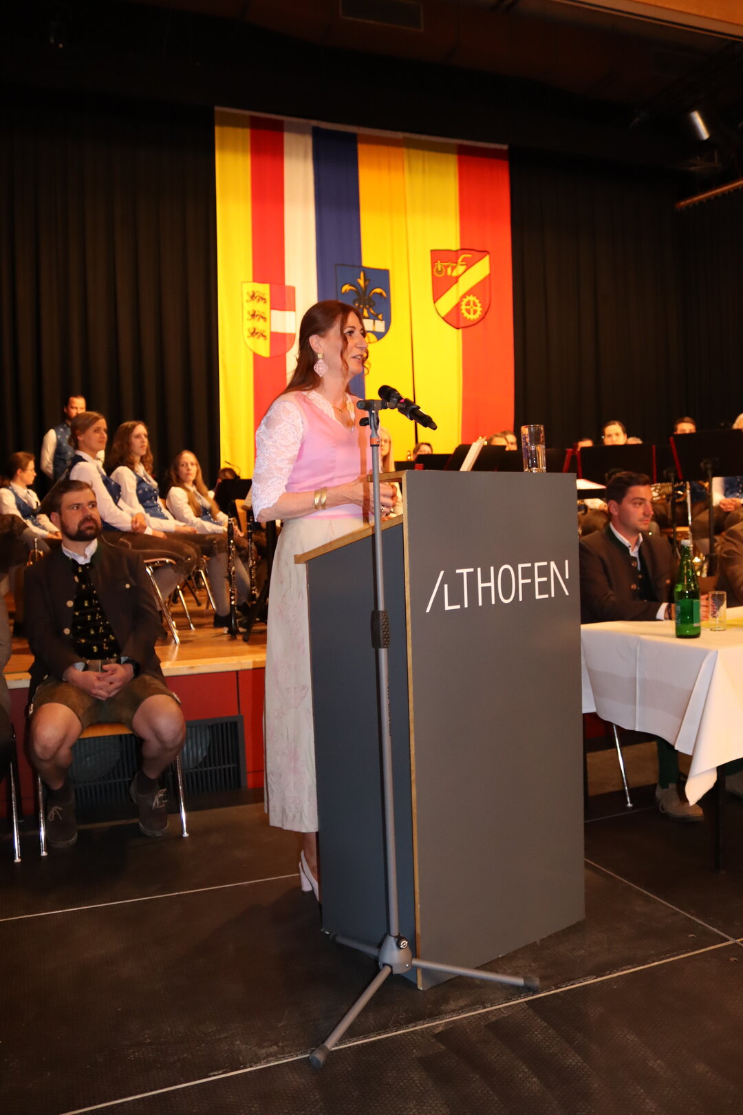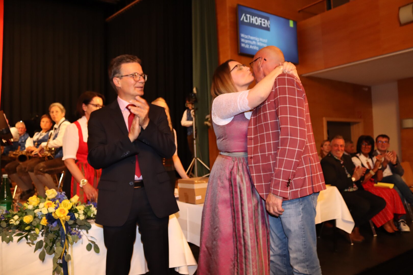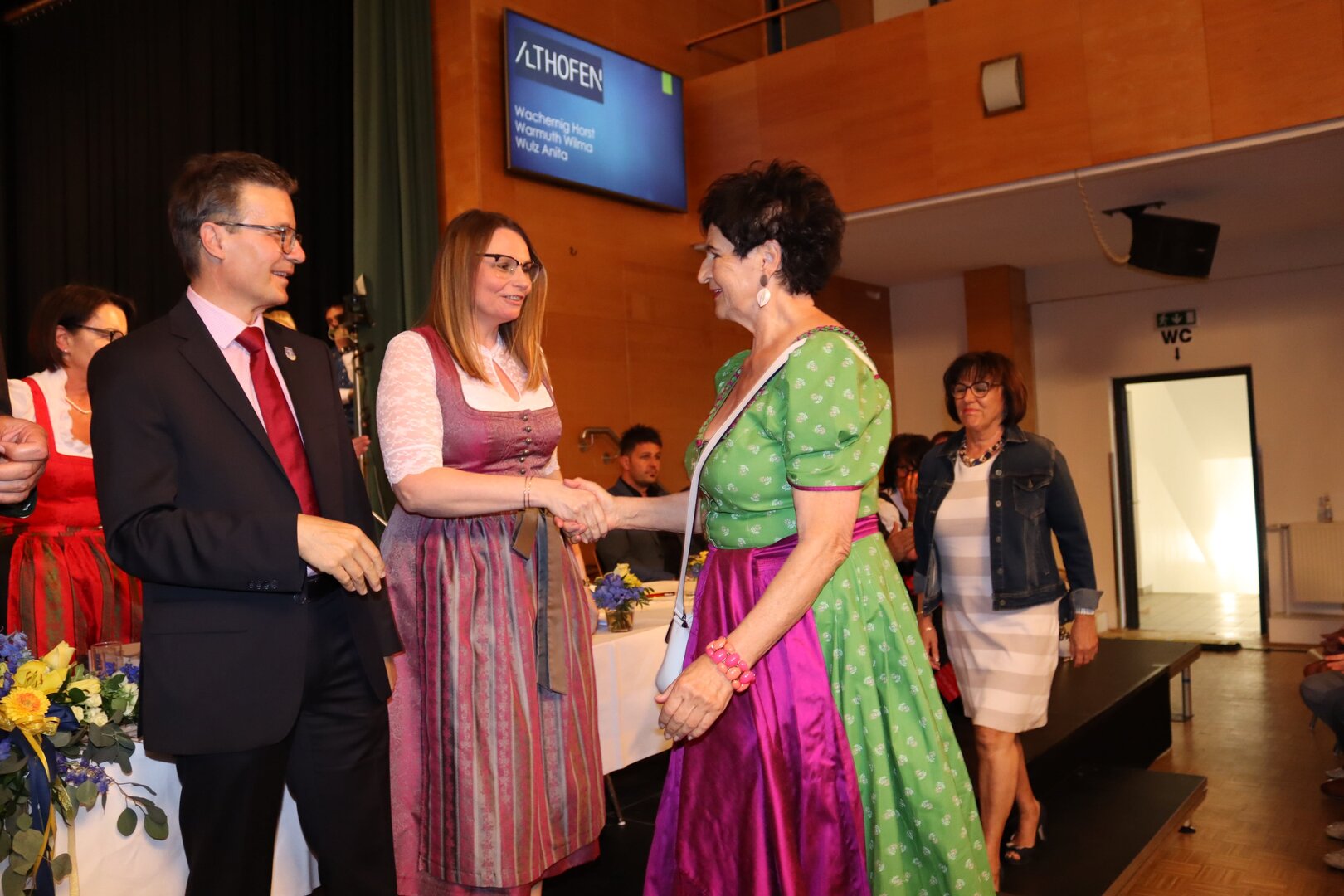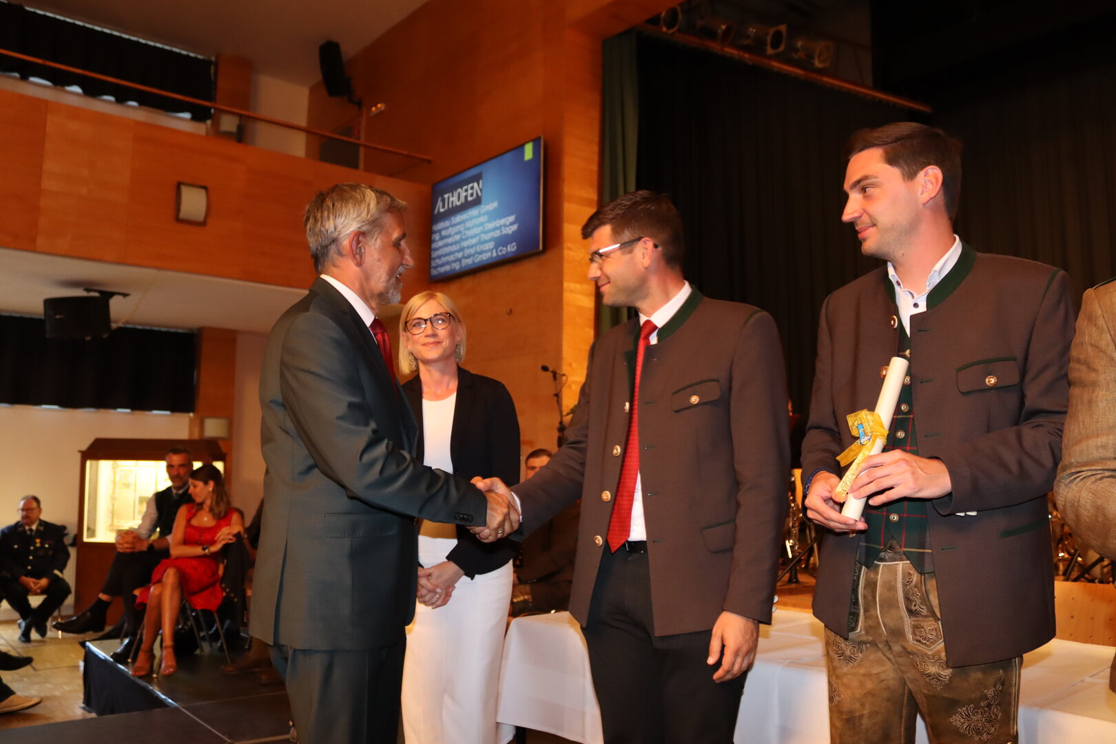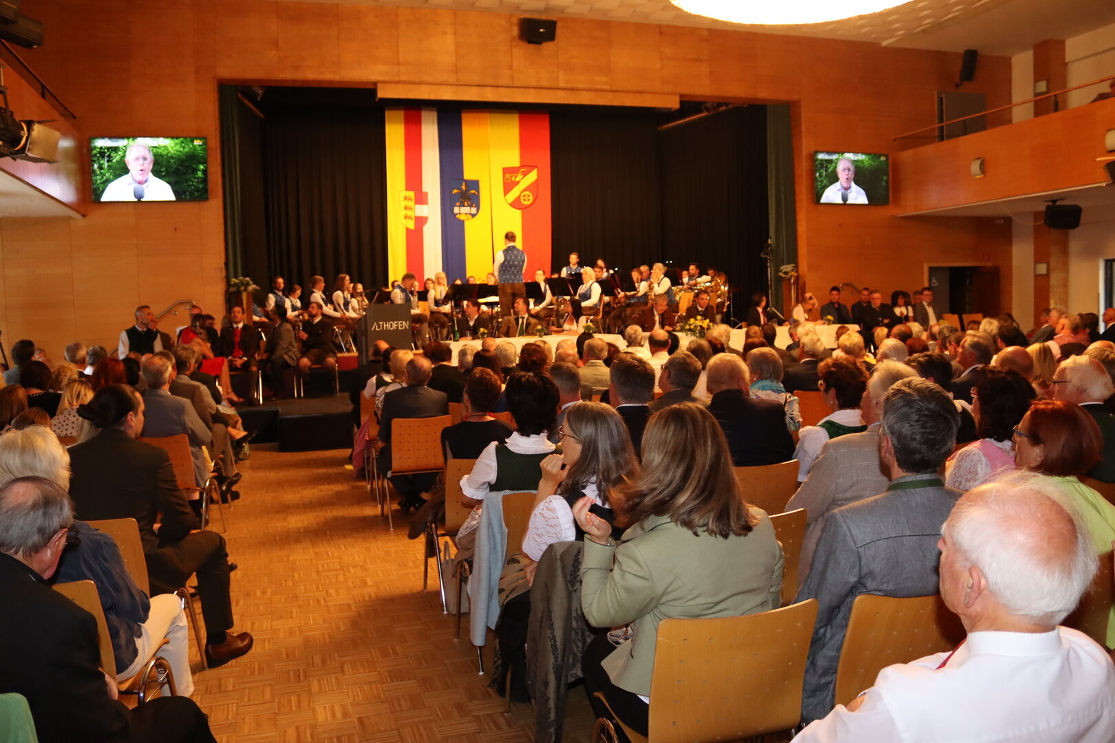 Vorne am Podium Platz genommen haben neben Bürgermeister Walter Zemrosser auch die Vize-Bürgermeister Doris Hofstätter und Michael Baumgartner, die Stadträte Philipp Strutz und Wolfgang Leitner, Gemeinderätin Corina Spendier sowie Stadtamtsleiter Hubert Madrian. Eröffnet wurde der Abend durch Bürgermeister Zemrosser, der auch die Moderation übernahm. Die Festrede hielt Alfred Ogris. Der damalige Landesarchiv-Direktor blickte in seiner Ansprache auf die Ereignisse 1993 zurück und gab einen Einblick in das heutige Althofen. Eine Grußbotschaft per Video übermittelte der Landeshauptmann von 1993, Christof Zernatto. Festansprachen hielten LH-Stv. Martin Gruber, NR Bgm. Klaus Köchl und Bezirkshauptfrau Claudia Egger-Grillitsch. Sie hoben in ihren Lobreden die Bedeutung der „Krappfeld-Metropole“ hervor. Martin Bernhard, Bürgermeister der Partnerstadt Tamm in Baden-Württemberg (Deutschland), überraschte mit der Ankündigung, dass es künftig in Tamm eine „Althofener Straße“ geben wird. Zudem würdigten die Fraktionssprecher Vize-Bürgermeisterin Doris Hofstätter, Stadtrat Wolfgang Leitner und Gemeinderätin Corina Spendier „ihre“ Stadt.