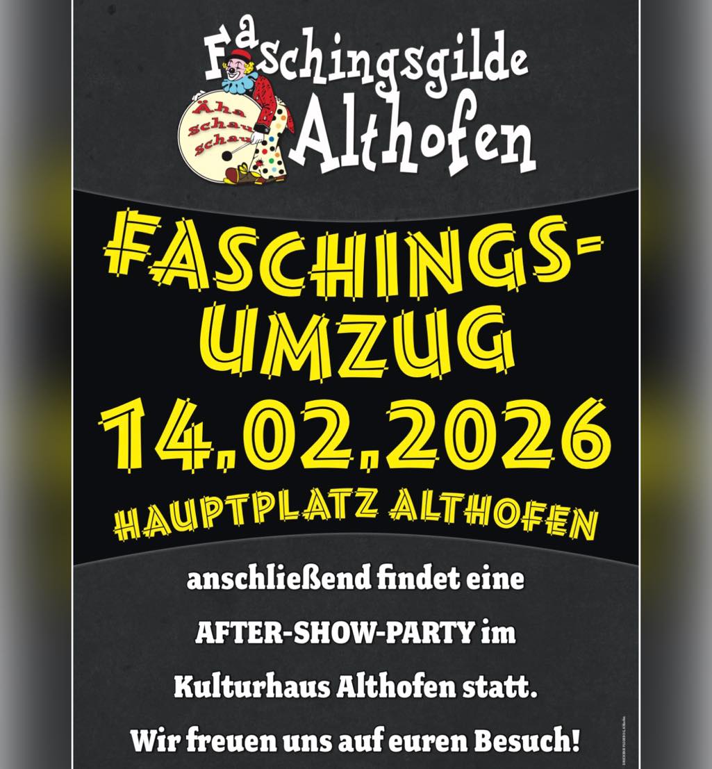 Die Faschingsgilde lädt zum großen Faschingsumzug durch die Althofener Innenstadt. Im Anschluss After-Show-Party im Kulturhaus Althofen.